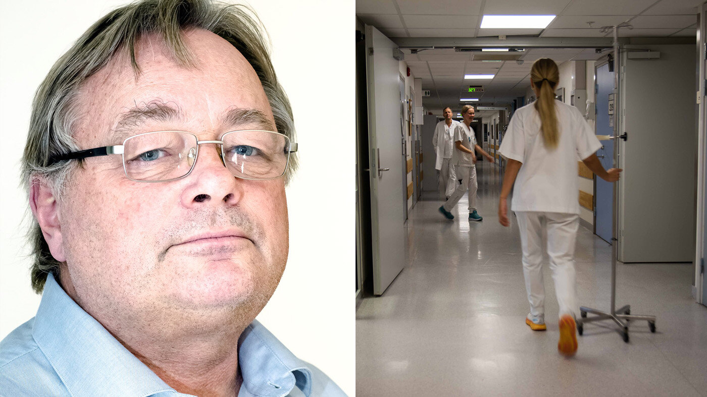 Bildet viser en Leif E. Moland og en korridor med sykepleiere.