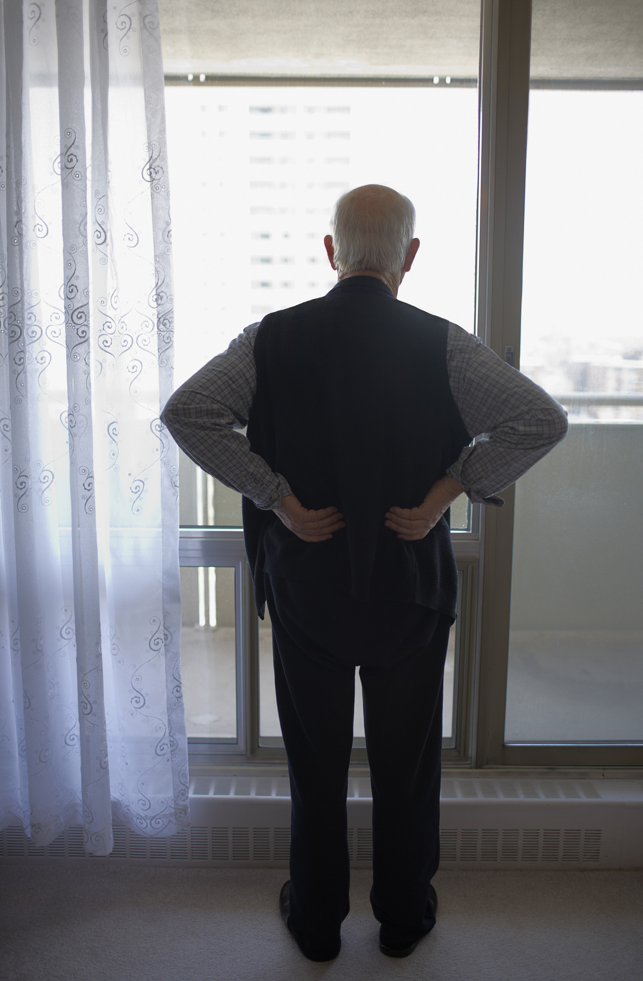 Bildet viser en eldre mann som står med ryggen til