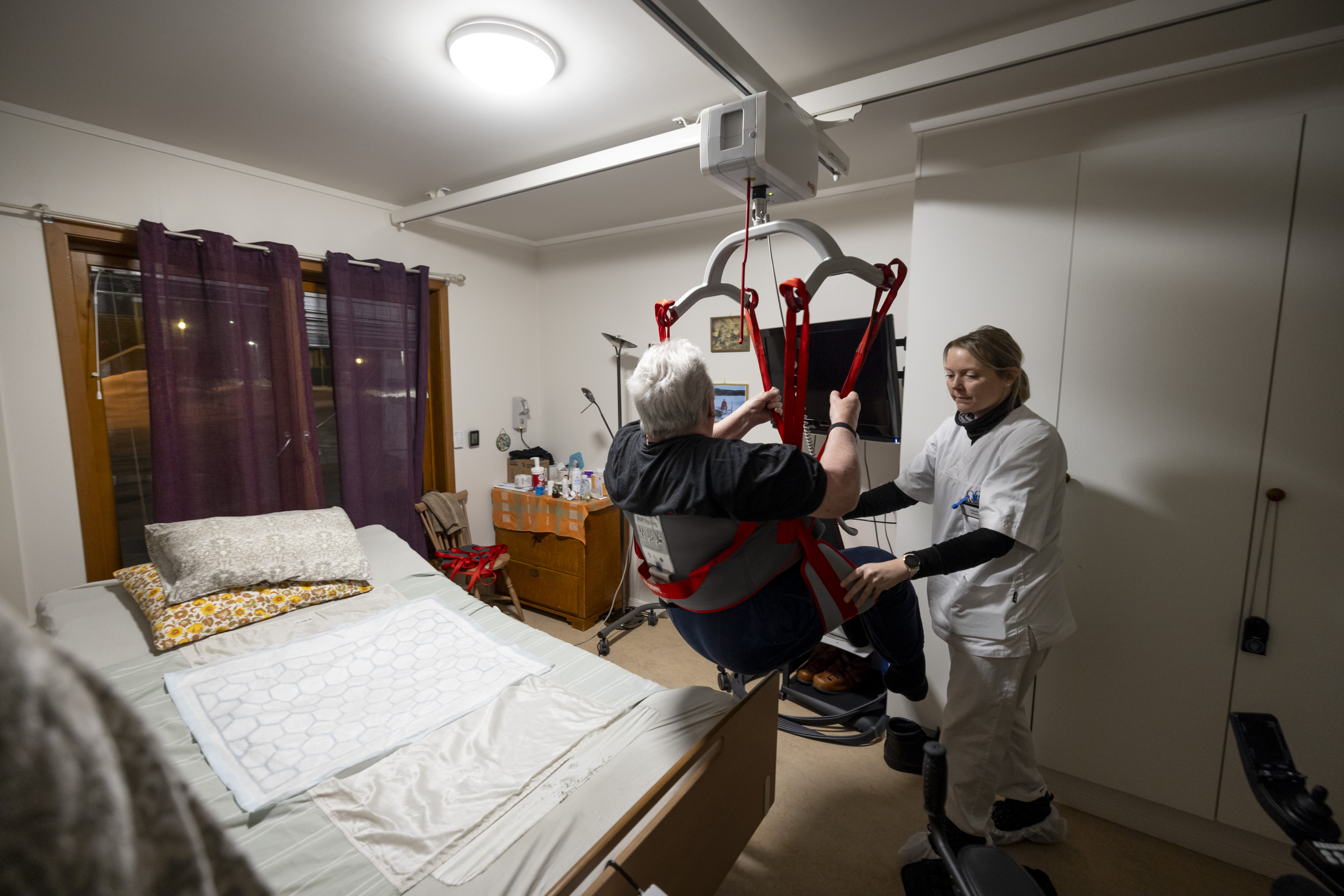 Han trenger hjelp for å komme seg fra rullestol til senga. Ingvill og Per Gabriel kjenner hverandre godt fra tidligere besøk.
