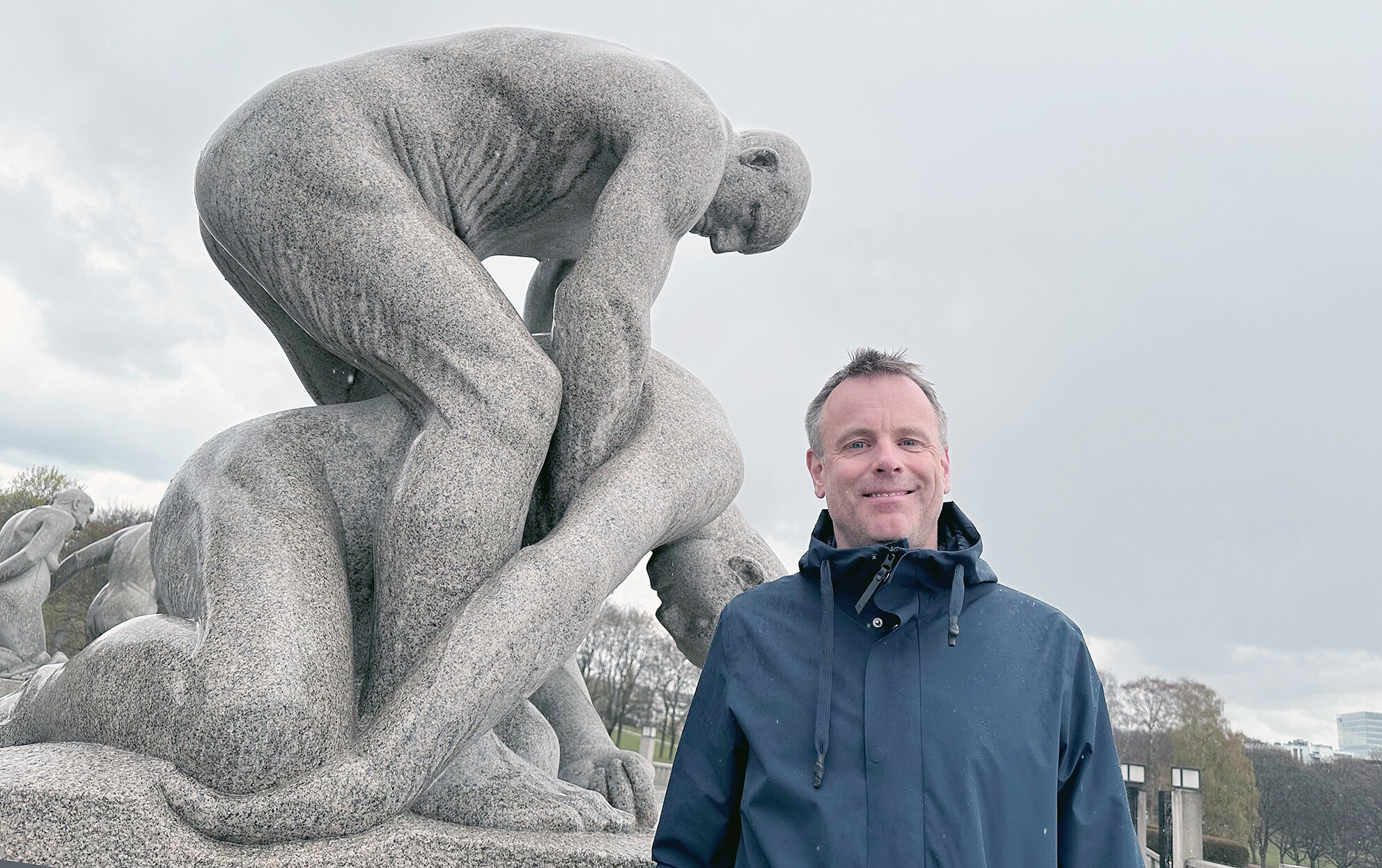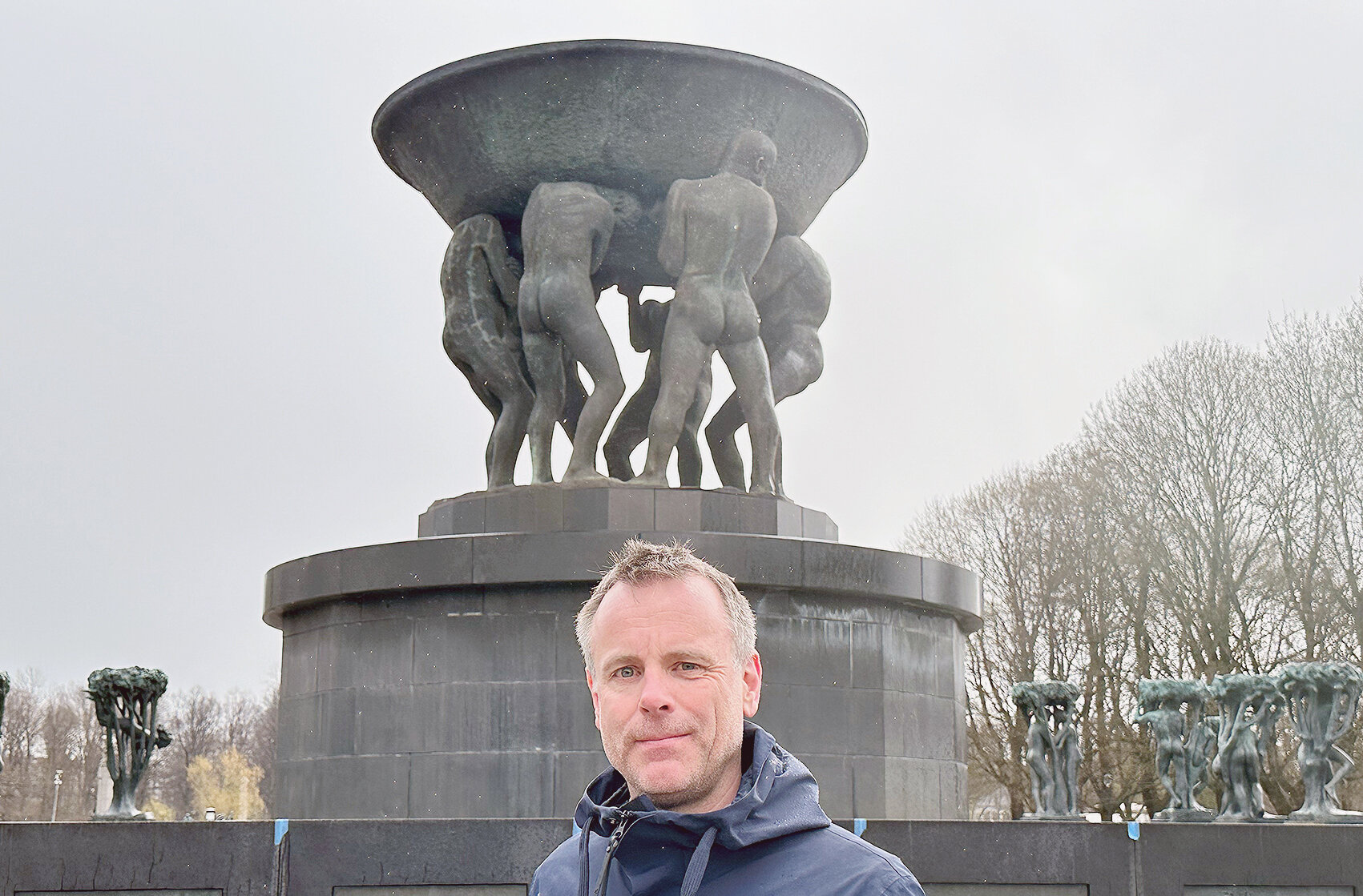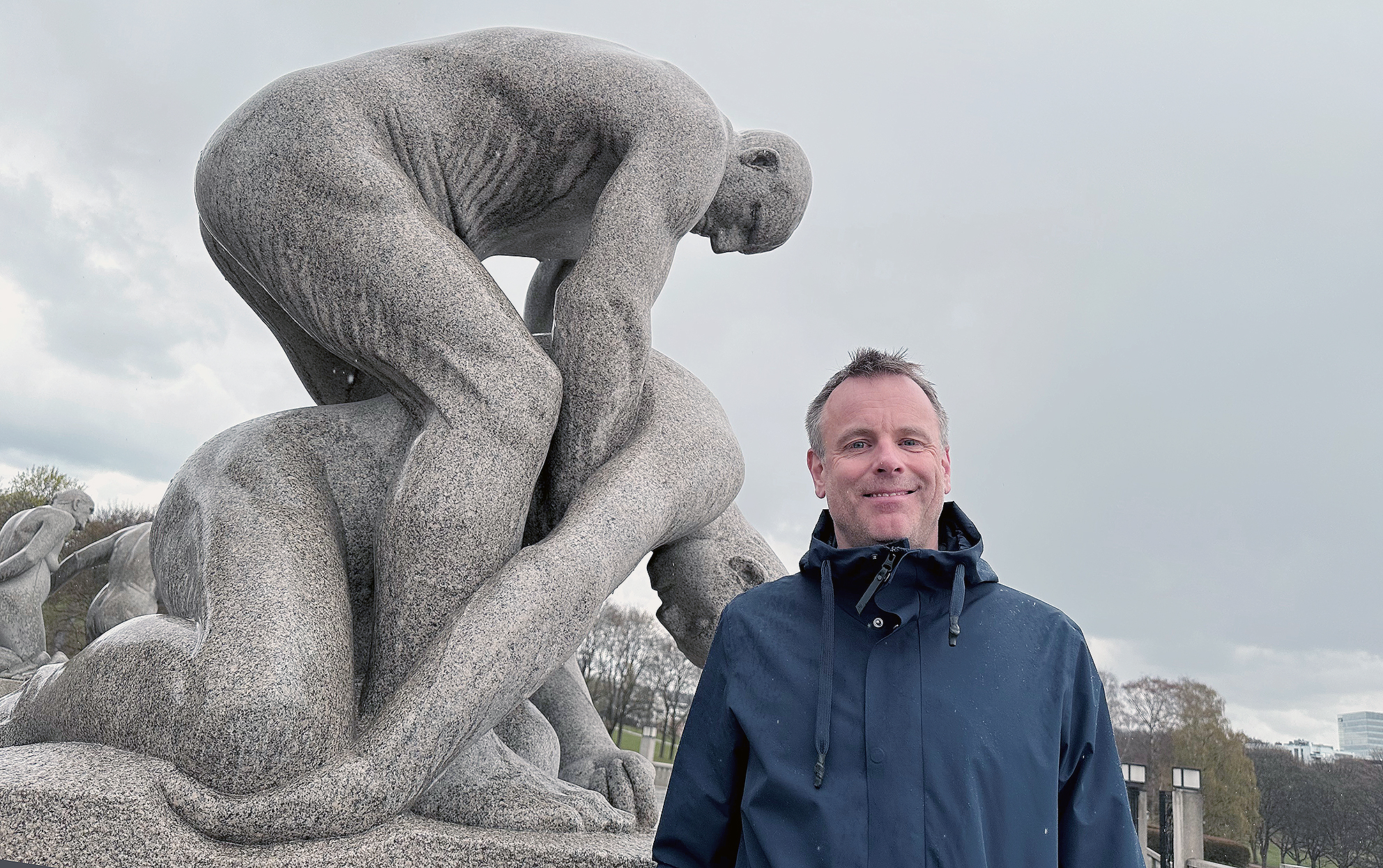 Sykepleien møter faggruppelederen i Frognerparken i Oslo. Parken er kjente tomter for Espen Gade Rolland. Hans forfedre solgte området til Oslo kommune i 1869, eller Kristiania, som det het den gang. Familien Gade var de siste private eierne av parken.