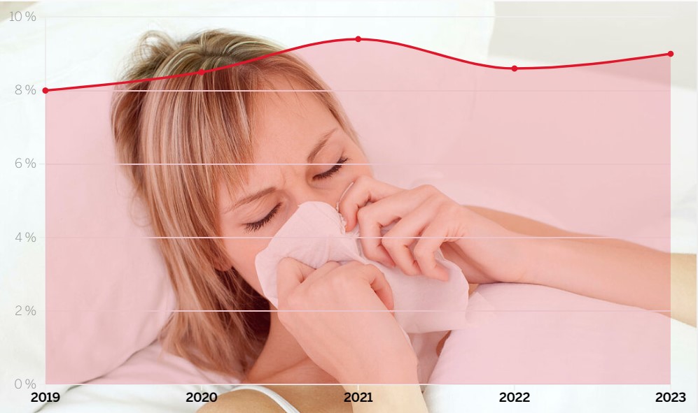 Fra 2019 til 2023 økte det legemeldte sykefraværet fra 4,8 til 5,6, en prosentvis vekst på 17 prosent, viser Nav-analysen i «Arbeid og Velferd». Ikke siden 2004 og 2009 har det vært tilsvarende høyt sykefravær.