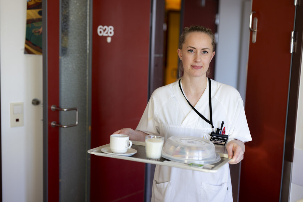 En av oppgavene hennes er å følge pasienter som har behov for det, ut fra avdelingen. En annen er å servere og berike mat og følge med på drikkelister.