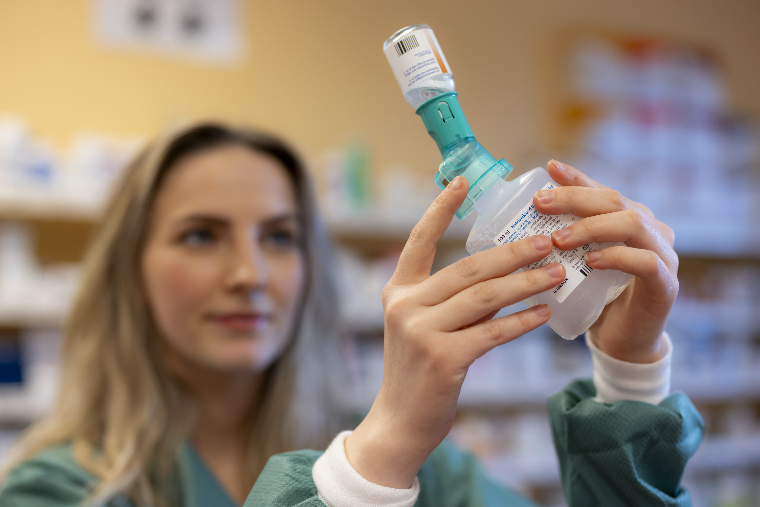 Og litt lenger unna, inne på medisinrommet, står sykepleier Emilie Frivåg i dyp konsentrasjon. Hun regner og sjekker mens hun blander antibiotika til pasientene på avdelingen.
