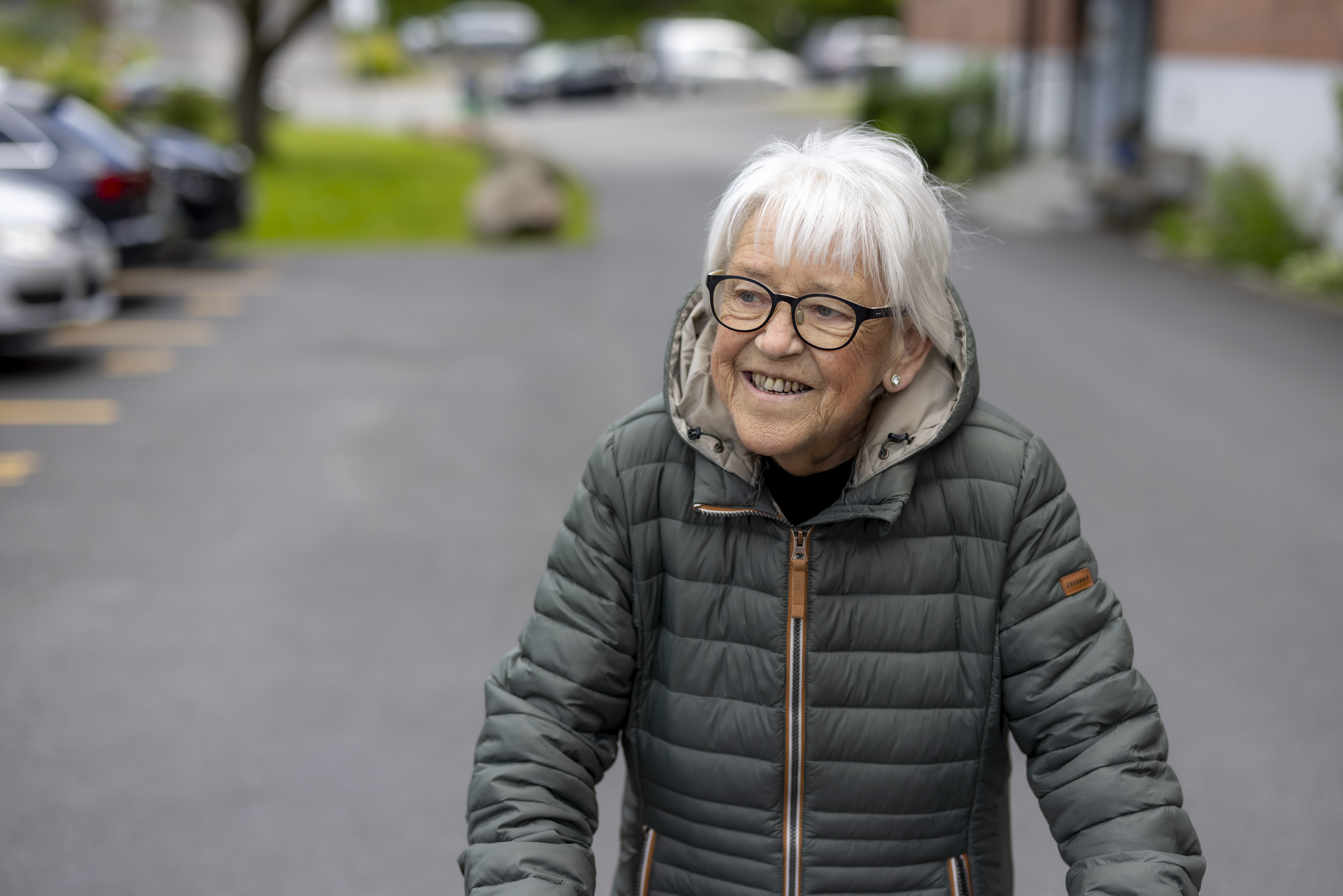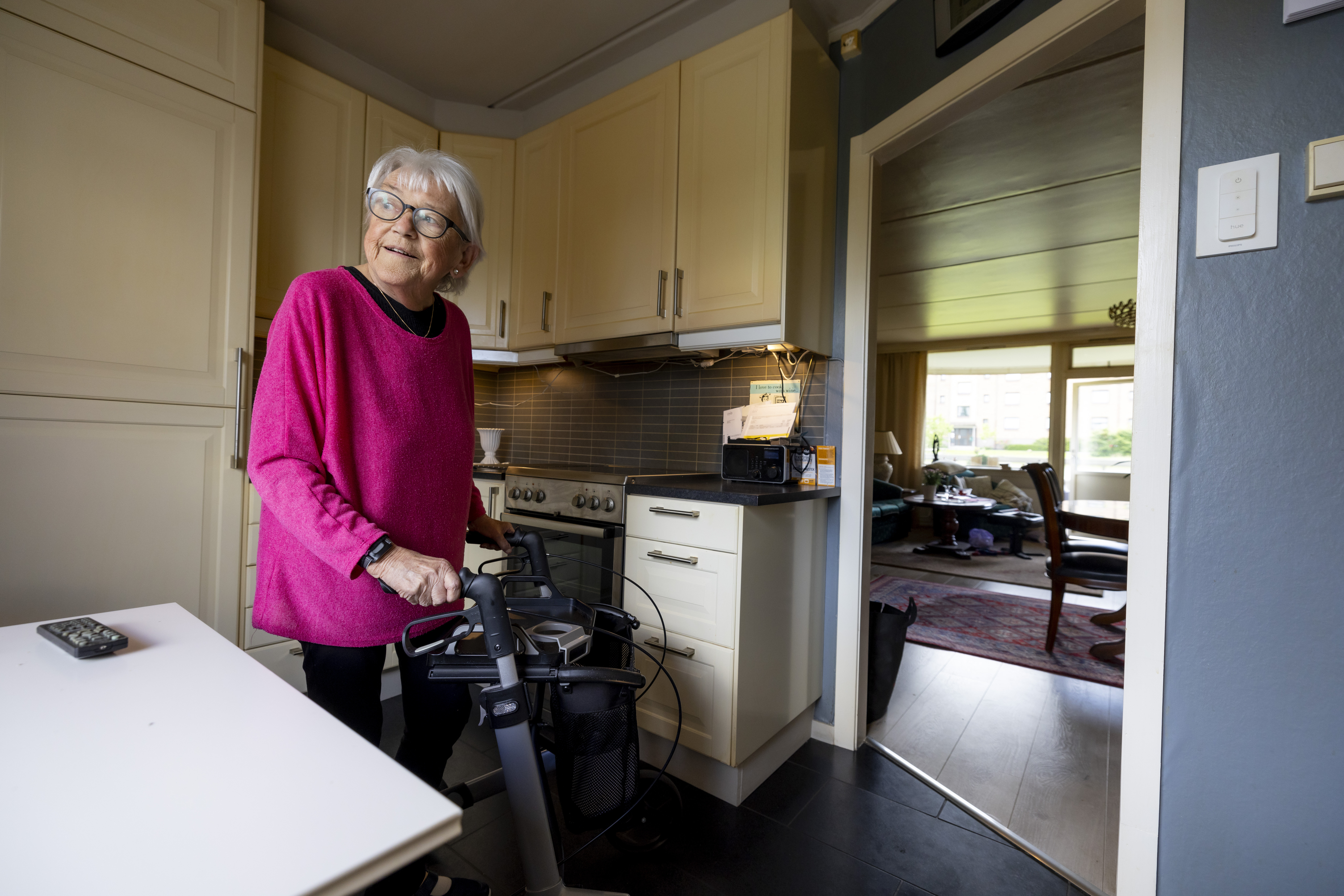 – Jeg har fått fantastisk oppfølging fra bydelen etter at jeg kom hjem. Her kom det en ergoterapeut med en gang, og jeg har fått en gåstol til å ha inne og en som står ute. Dusjstol har jeg – og en trygghetsalarm, sier hun og viser frem alarmen på håndleddet.