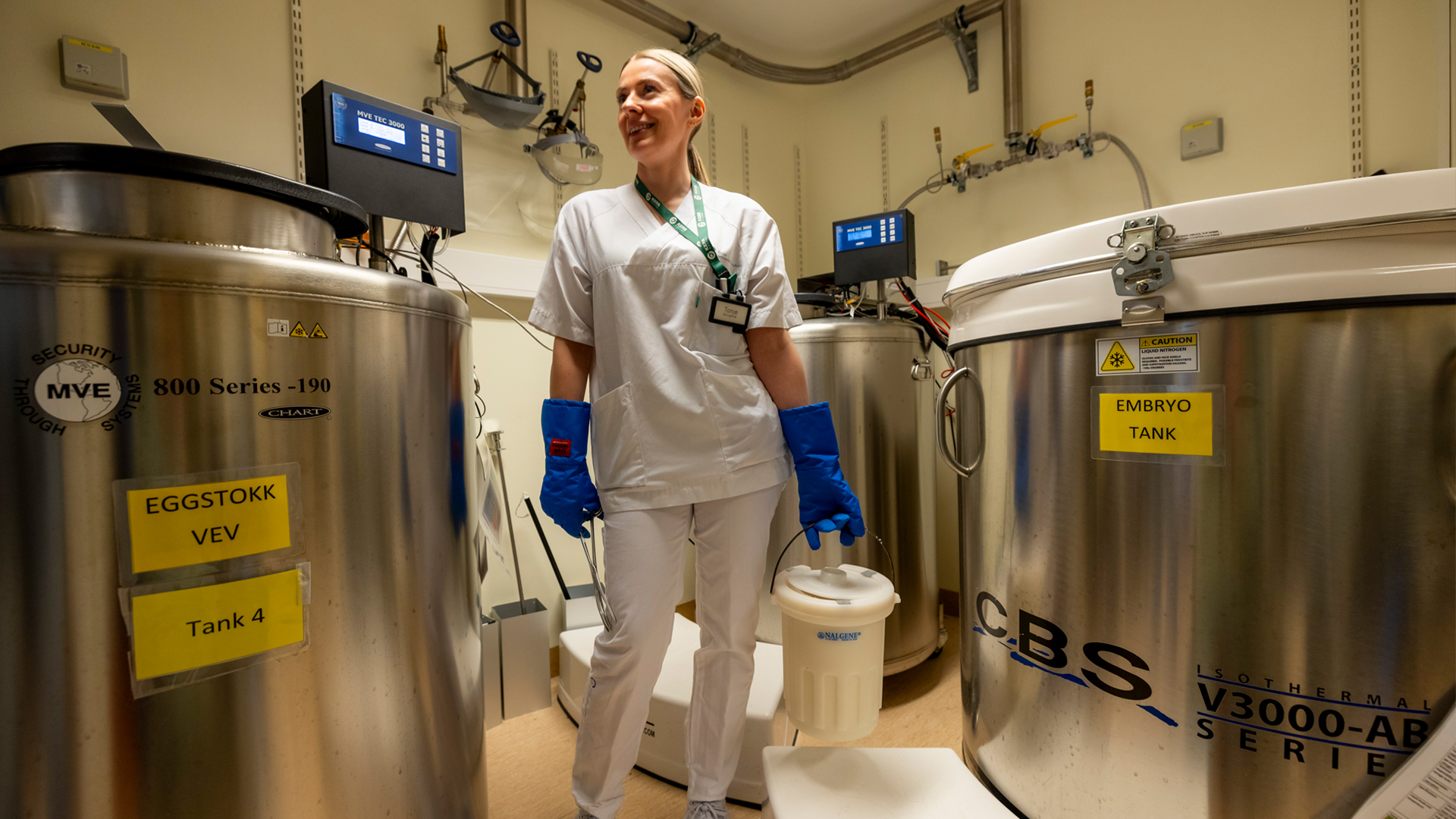 KALDE CELLER: Bioingeniør Tonje Tornes må bruke tykke hansker når hun skal håndtere den nedfryste sæden. Video og journalist: Nina Hernæs. Klipp og redigering: Hilde Rebård Evensen