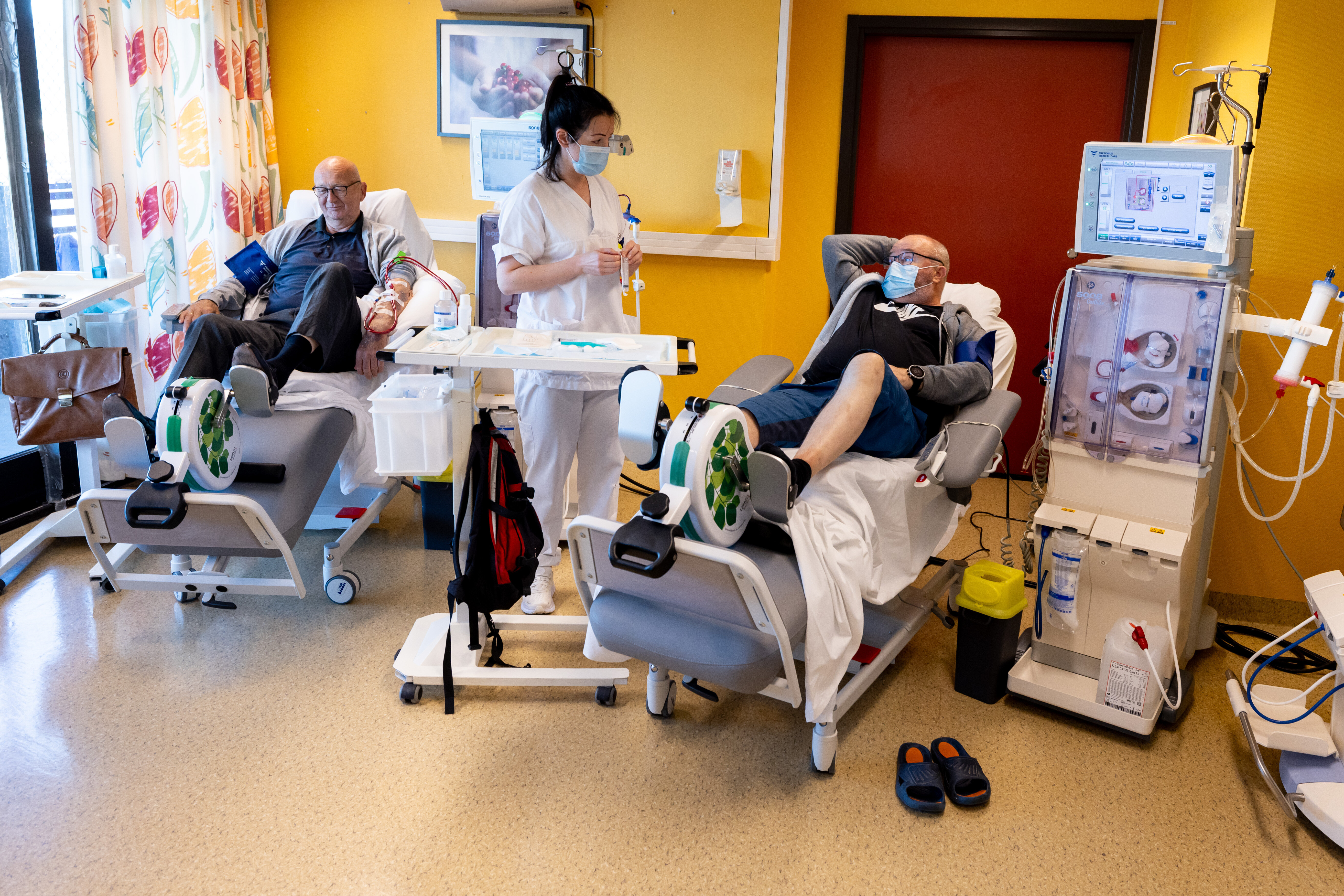 Pasientene sykler i rundt to av de fire timene dialysen pågår.