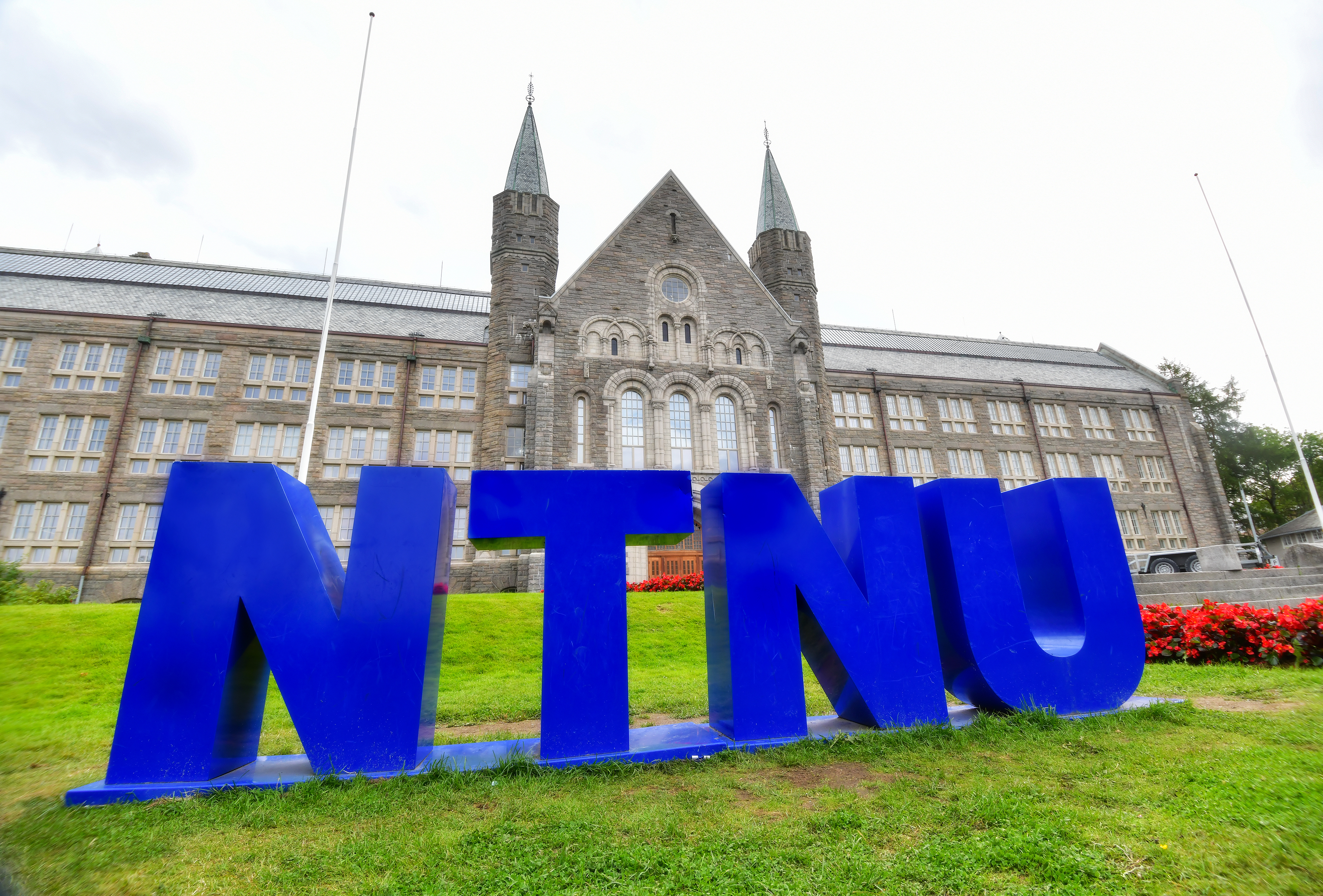 Bildeviser logoen til NTNU på gressplenen foran den gamle hovedinngangen