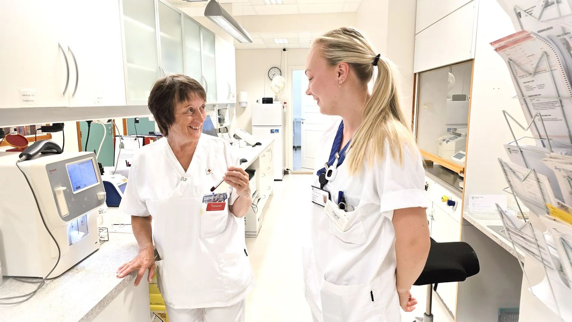 Bildet vider til sykepleiere som står på medisinrommet og snakker