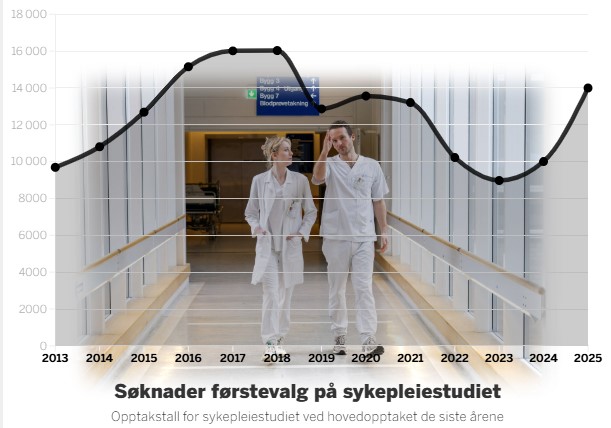 - Nesten 14 000 søkere har sykepleie som førstevalg. Det er 4000 flere enn i fjor.