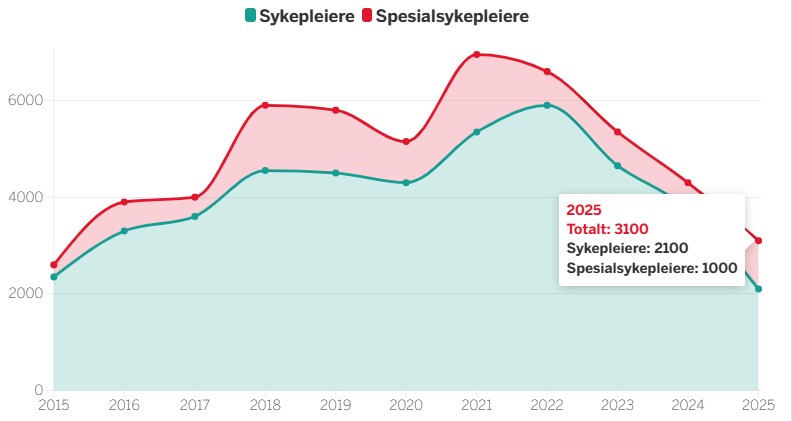 Det mangler 3100 sykepleiere i 2025, ifølge ferske tall fra Nav. Det er under halvparten av hvor mange som manglet i 2021. – Sykepleiermangelen er fortsatt stor, sier NSFs forbundsleder.