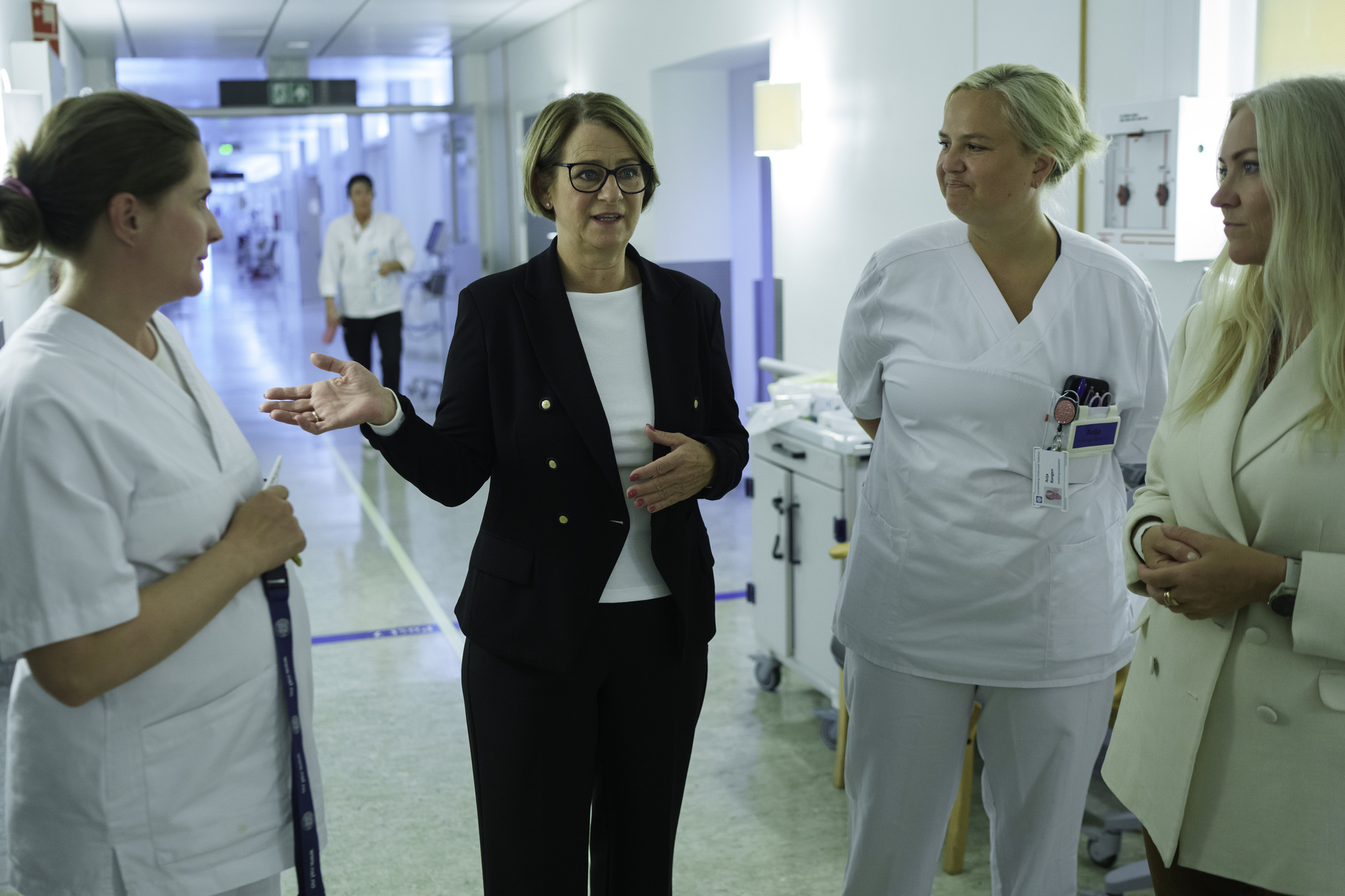 Trøen er på Lovisenberg Diakonale Sykehus i Oslo, hvor hun møter sykepleiere som forteller om en forsøksordning med lengre vakter for ansatte som ønsker det.