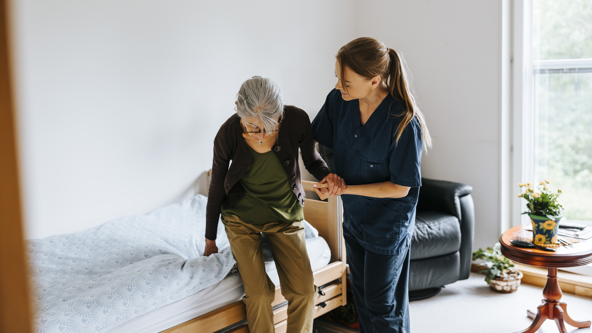 Bildet viser en sykepleier som hjelper en pasient opp av sengen