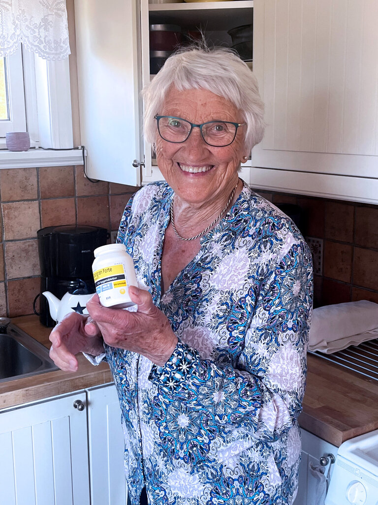 Kjøkkenbordet er dekket til frokost for to. Hjemmebakt brød og jordbærsyltetøy, akkurat passe kokte egg, kaviar, brunost og noe grønt. Den for lengst pensjonerte sykepleieren ser ut til å greie seg svært bra selv, og noen medisiner har hun aldri trengt. Bortsett fra Calcigran.