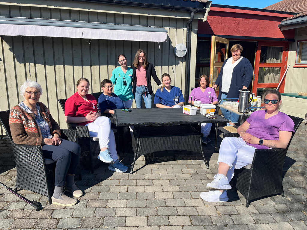 Vi går ut i sansehagen til ansatte, som nå skal ha en liten fredagsstund. De er glade i søtsaker, og lurer på hvilket helsepersonell som ikke er det? Is, peanøtter, lotteri og en stor porsjon humor. Den er viktig for å stå i yrket, mener gjengen. Tre ord vil de si om jobben på sykehjemmet: