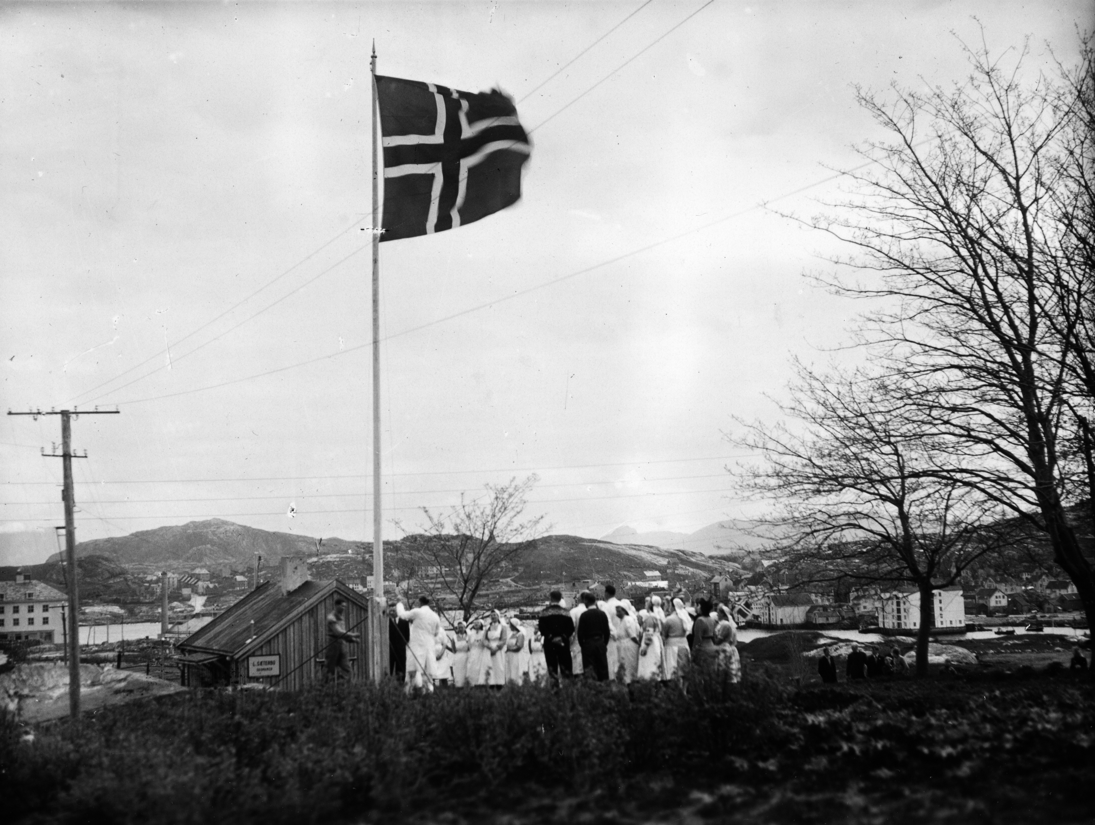 Blinkskudd Flagger for frigjøring8. mai 1945. En gruppe sykesøstre fra Røde Kors' søsterhjem heiste det norske flagget på frigjøringsdagen. Bildet er fra Kristiansund. Fotograf: Ukjent. Eier: Nordmørsmusea ASFlere blinkskuddØystein HelmikstølVaktsjef/journalistAnnonseAnnonse