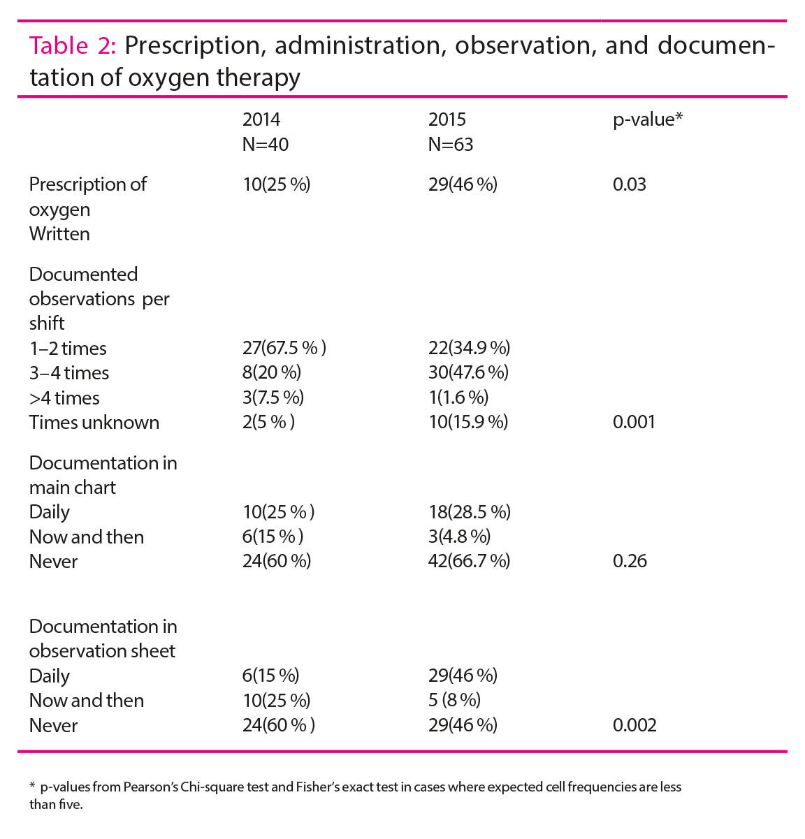 The results are presented descriptively with frequency count and percentagewise distributions. For each time period we made frequency counts of the diagnosis distribution (bronchiolitis/pneumonia), gender distribution, age distribution, number of hospital bed days, number of patients with written prescription for oxygen, number of observations per shift, frequency of registration on chart, and frequency of use of separate observation sheets. We tested for significant differences between the two time periods with Pearson’s Chi-square test. In cases with expected cell-frequencies less than five, Fisher’s exact test was used. We used spreadsheets in Excel and Stata IC version 14 to analyse the data.