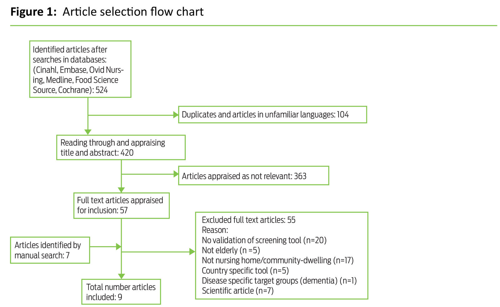 The literature searches yielded a total of 524 articles. After having removed duplicates of articles found in different databases and articles in unfamiliar languages, 420 articles remained. We assessed title and abstract of the studies in accordance with the inclusion criteria. This process resulted in 57 articles, which were read in full. We divided the articles between us and quality assured what had been abstracted by going through all articles together. An additional seven articles were found by going through reference lists of included articles and key survey articles. Of 64 articles 55 were excluded, mainly because they did not represent validation studies (n=20), or because the validation was not performed in a nursing home or among community-dwelling elderly (n=17). This literature review is thus based on nine articles and the validation of four distinct screening tools. Only one of these tools, MNA_Short Form (MNA-SF), has been translated into Norwegian. The validated screening tools are presented in Table 3.