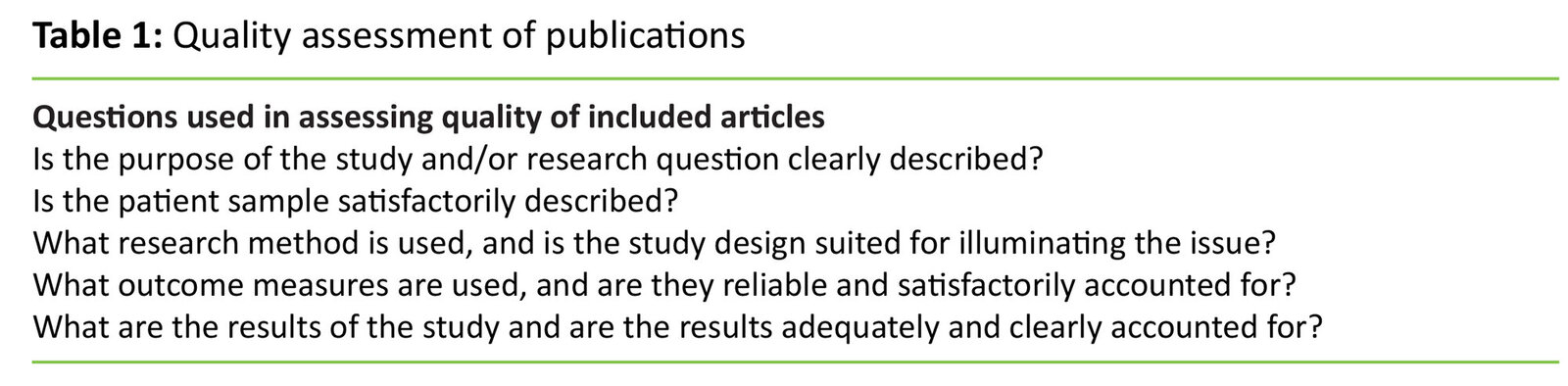 A survey of reference lists from key articles was performed. All identified articles were transferred to a data programme for processing and organisation of references, (EndNote X7) and screened for duplicates. All four authors subsequently went through the list of articles by looking at title and abstract and assessing the articles for inclusion. Disagreements were solved by discussion and reasons for exclusions were given. We then analysed the content in the included studies by reading the articles in accordance with recommendations in The Cochrane Handbook for Systematic Reviews of Interventions (20). As we included non-randomised studies, we used a pragmatic quality assessment model based on the Cochrane guidelines (Table 1).
