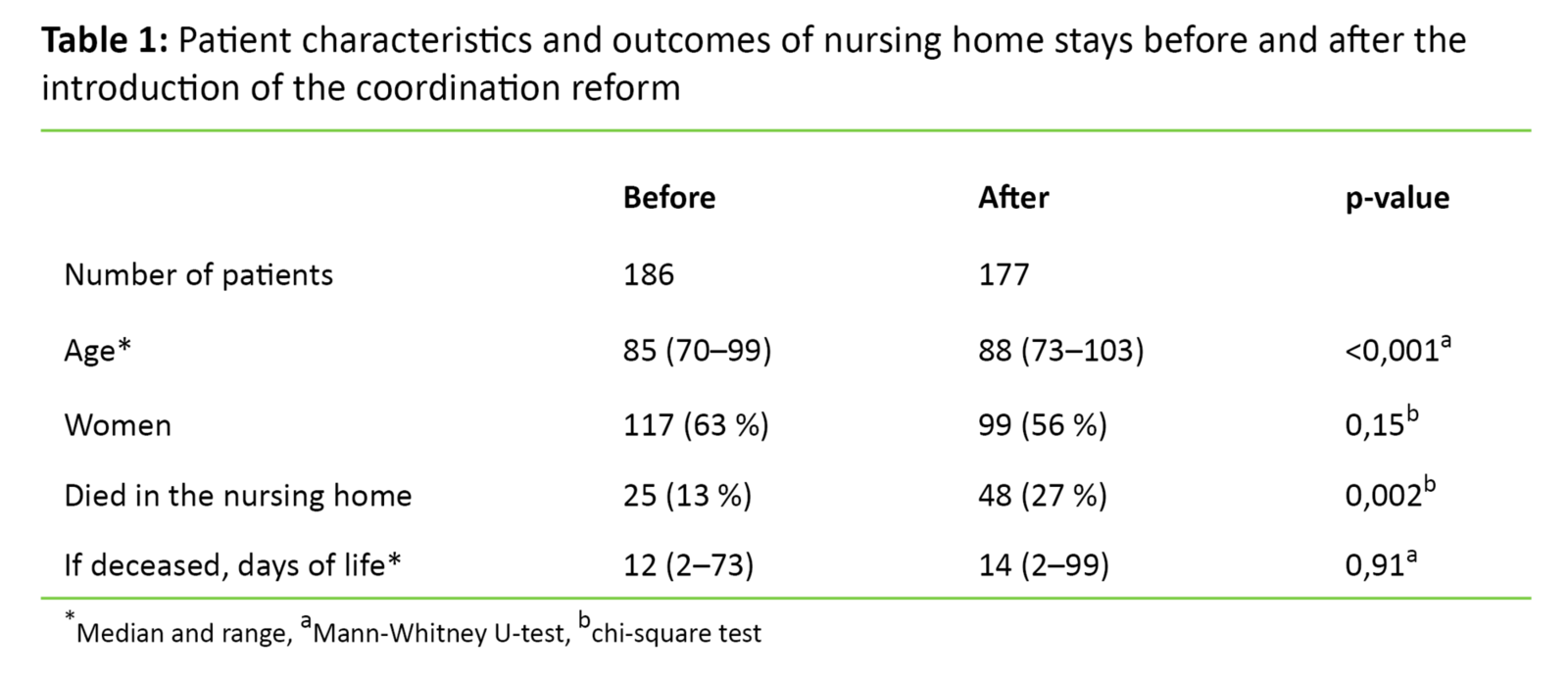 Results: We found that the number of patients who died in the nursing home after hospitalization doubled (27% versus 13%, p <0.002) following the introduction of the coordination reform. Compared with the situation before the reform, patients admitted after the reform were older (median 88 years (range 73–103) versus 85 years (range 70–99), p <0.001). Fewer patients were transferred to a different nursing home (21% versus 45%, p < 0.001), and more were discharged to their own home (47% versus 36%, p = 0.04).