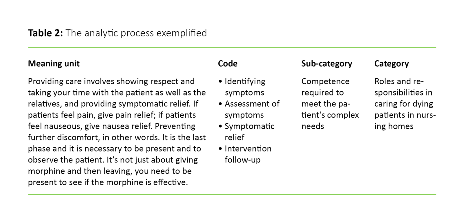 The results showed that the complexities involved with providing care and treatment for dying patients in nursing homes call for “more of everything”, which requires considerable knowledge as well as special skills and attitudes. Moreover, the findings show that nurses are frequently “left to deal with everything on their own”, because the nursing home has a low staffing ratio and personnel are inadequately qualified. We will present the summary results in two categories with their associated sub-categories (table 3).