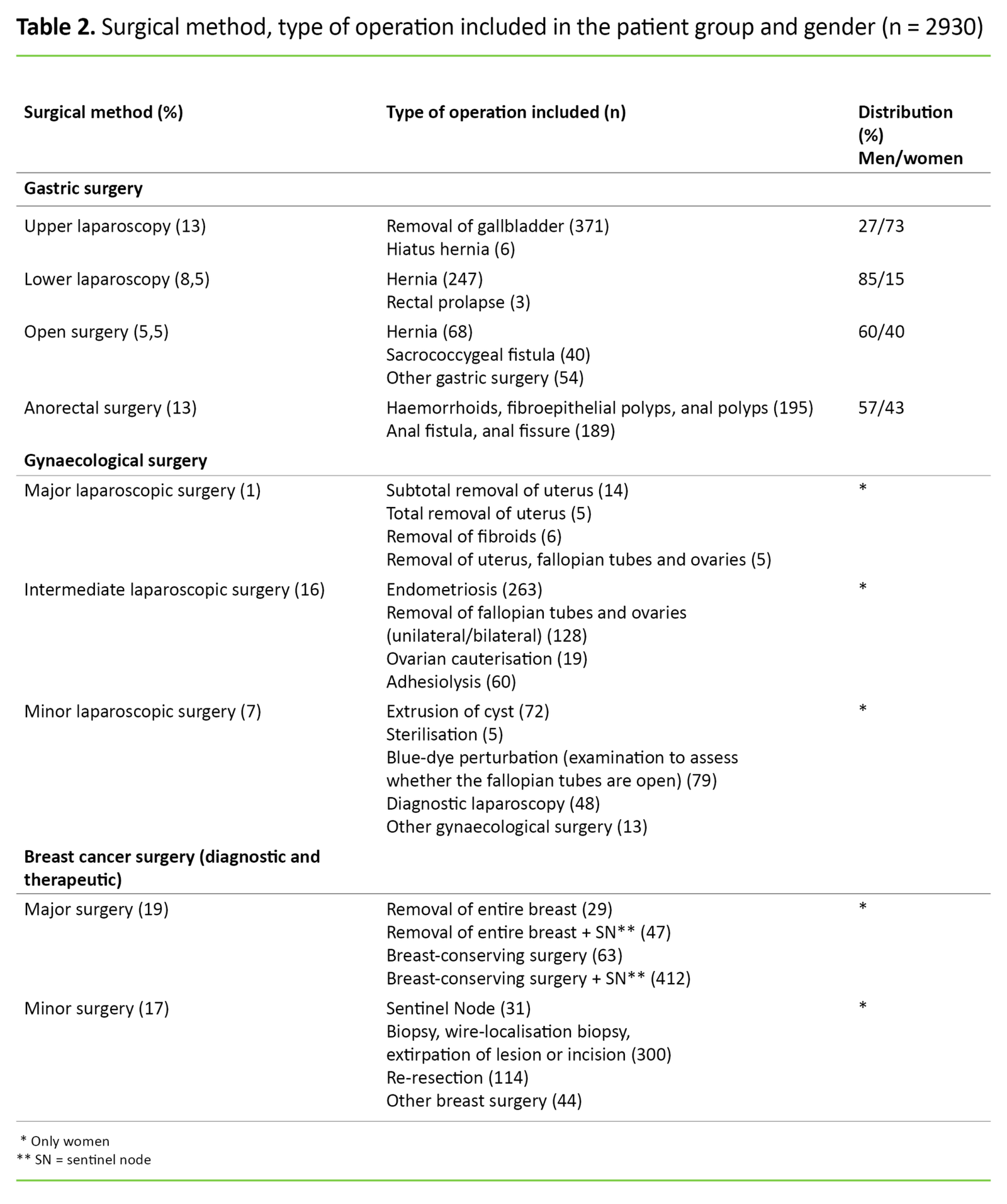 Table 2. Surgical method, type of operation included in the patient group and gender (n = 2930)