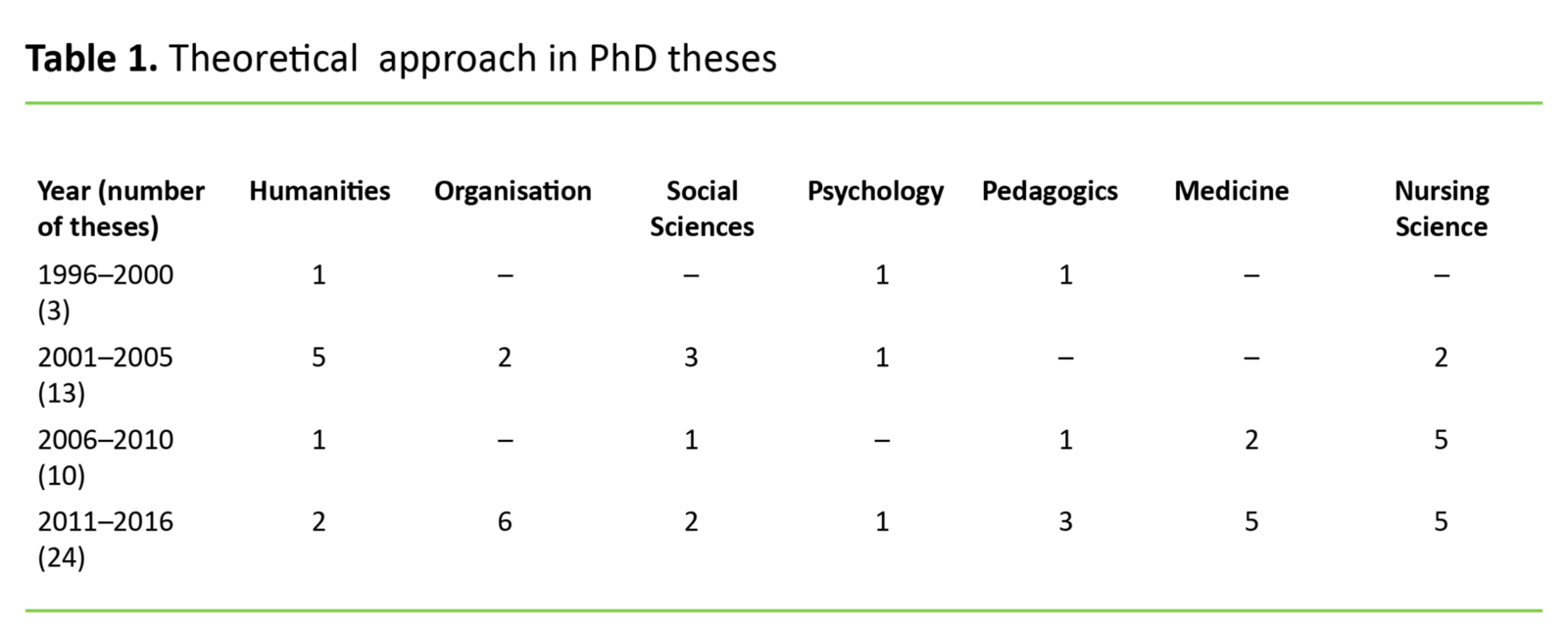 We have analysed the theses using deductive analysis. First, we read the summary and then parts of the thesis. At the second stage, we applied Heyman’s (8, p. 62) classification of theoretical perspectives: the humanities, organisational theory, social sciences, psychology, pedagogics and medicine. In our study, we analysed PhD theses in nursing science. Nevertheless, we construct nursing science as a separate category because some theses apply nursing theory.