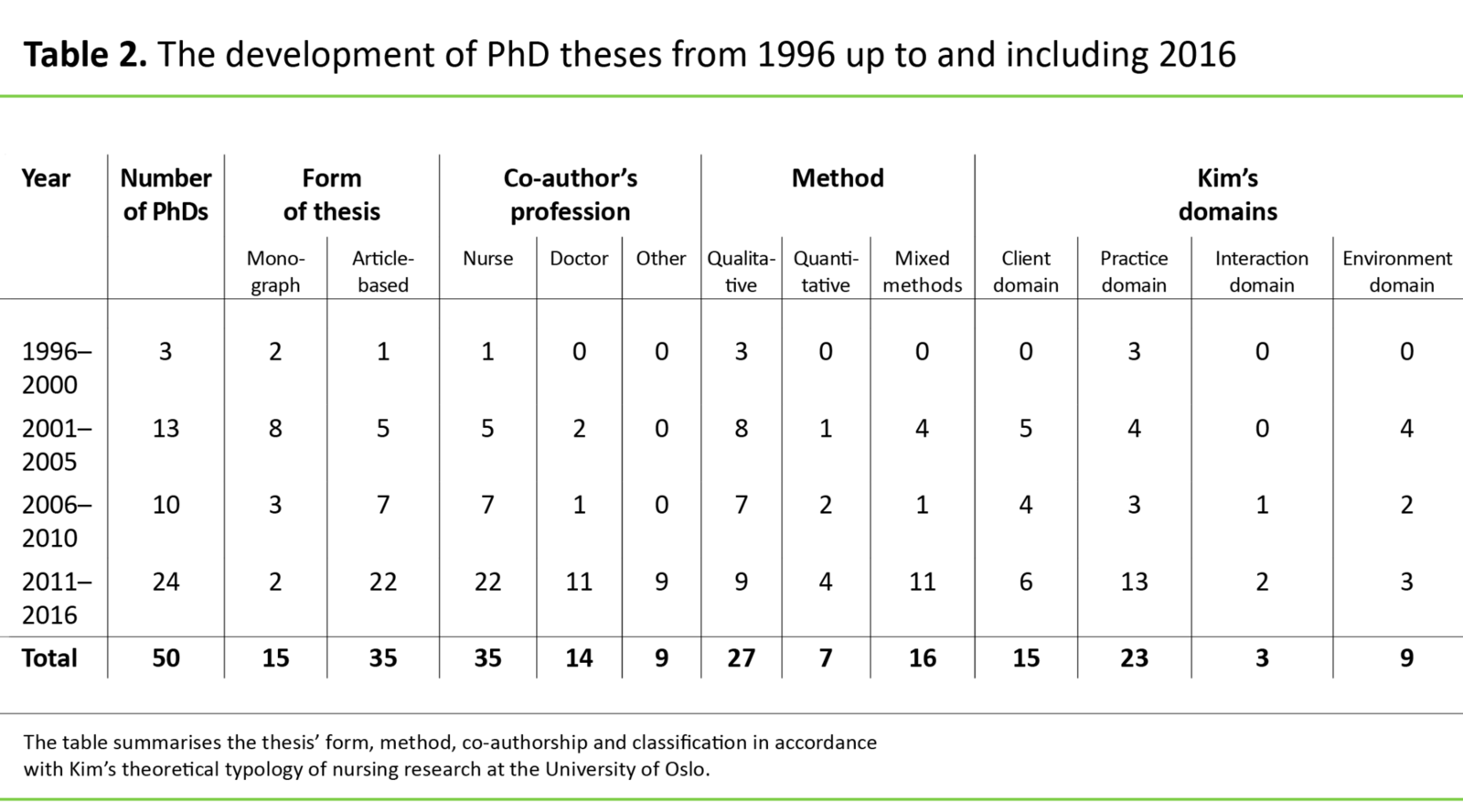 Seen in a twenty-year perspective, it is interesting to note that the theses in nursing science submitted to the University of Oslo have shifted from monographs, humanist approaches and the use of purely humanist approaches and qualitative methods. For the most part, the form of the theses has changed to article-based theses with multi-disciplinary authorship.