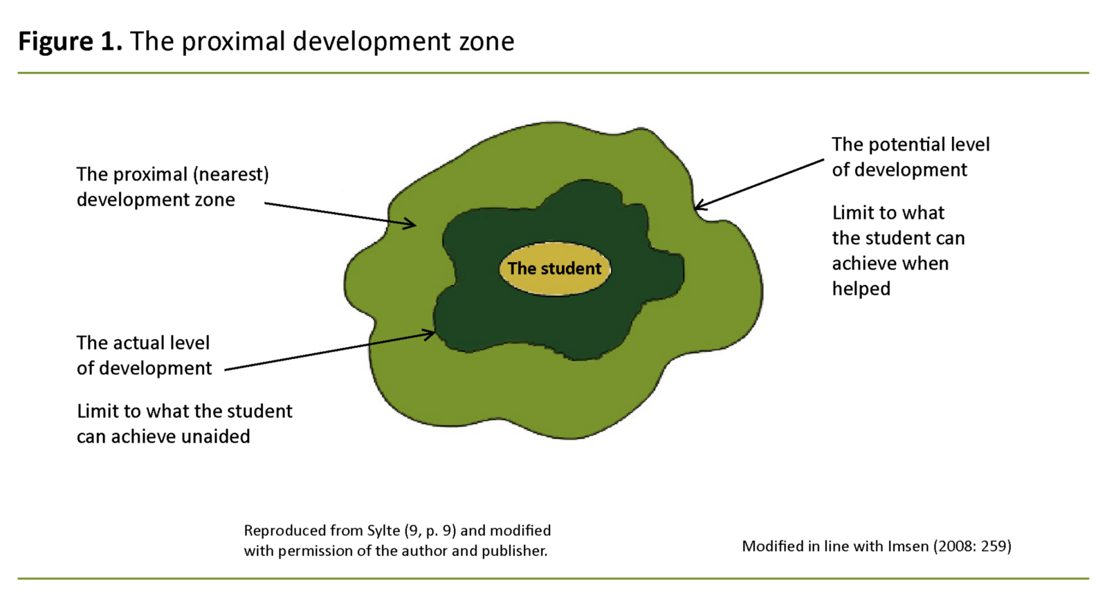 Vygotsky focused on helping the students in the zone of proximal development. This zone is the distance between the student’s actual level of development – where independent problem solving is mastered – and the student’s potential level of development – where problem solving can only be mastered through teacher guidance or in collaboration with more competent fellow students (8) (Figure 1).