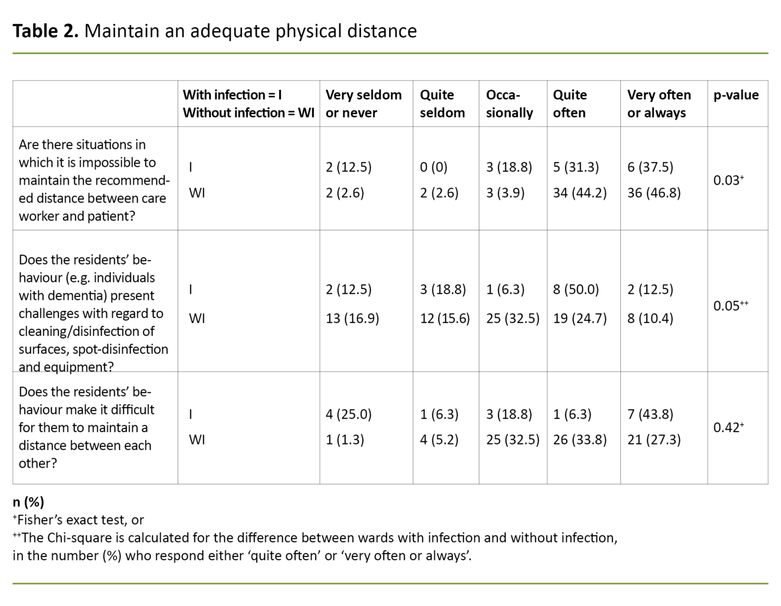 A significantly larger percentage of the wards without infection reported that they ‘quite often’ or ‘very often or always’ had situations in which maintaining the recommended distance between the care worker and the patients was impossible.