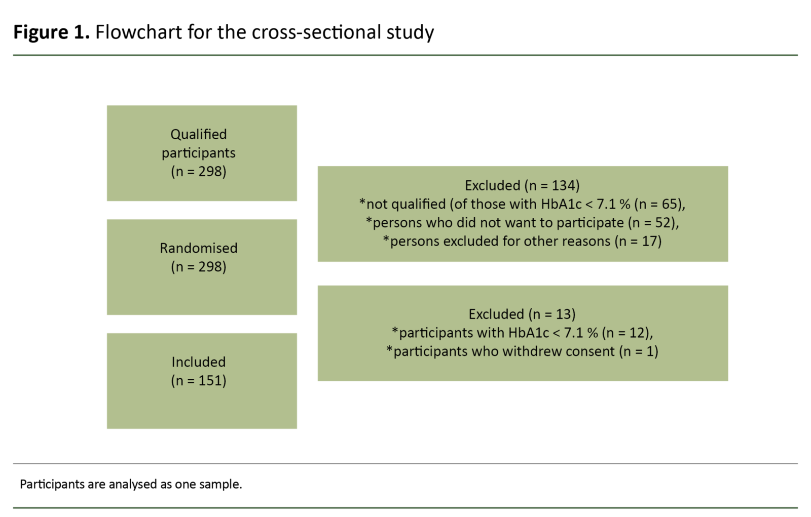 The inclusion criteria have already been described in detail (13). There was a total of 151 participants with type 2 diabetes at the start of the study (13). The sample in the randomised controlled trial was randomised into three groups, but in this study, they were analysed as one sample (n = 151).
