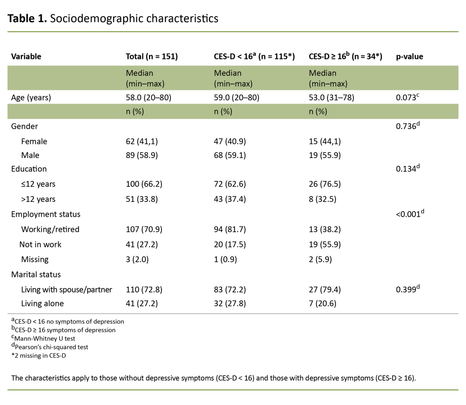 Of the participants, 100 had ≤ 12 years of education (66.2 per cent), 107 (70.9 per cent) were in employment, and 41 (27.2 per cent) lived alone (Table 1). A total of 34/149 of the participants (22.5 per cent) had symptoms of depression (CES-D ≥ 16).