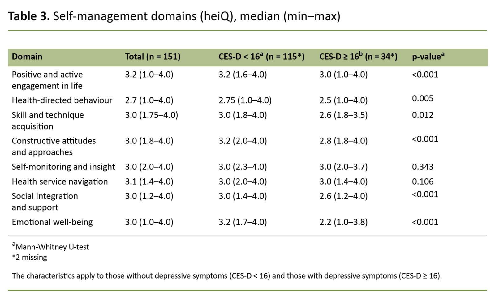 Table 3 shows self-management as measured by the heiQ and the association with reported depressive symptoms (CES-D). We found that those who reported depressive symptoms scored lower on six out of eight self-management domains measured by the heiQ.