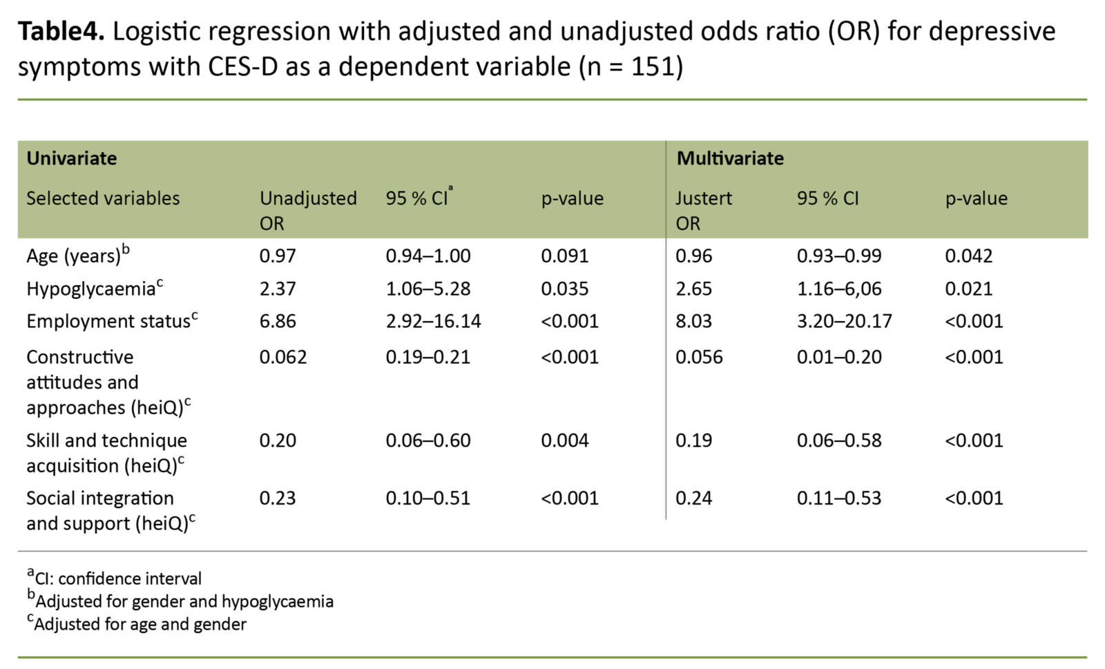 The variables from the univariate and unadjusted analyses that showed a statistically significant association with CES-D were included in logistic regression analyses, which were adjusted for age, gender and hypoglycaemia. The significance level chosen was 5 per cent and two-sided.