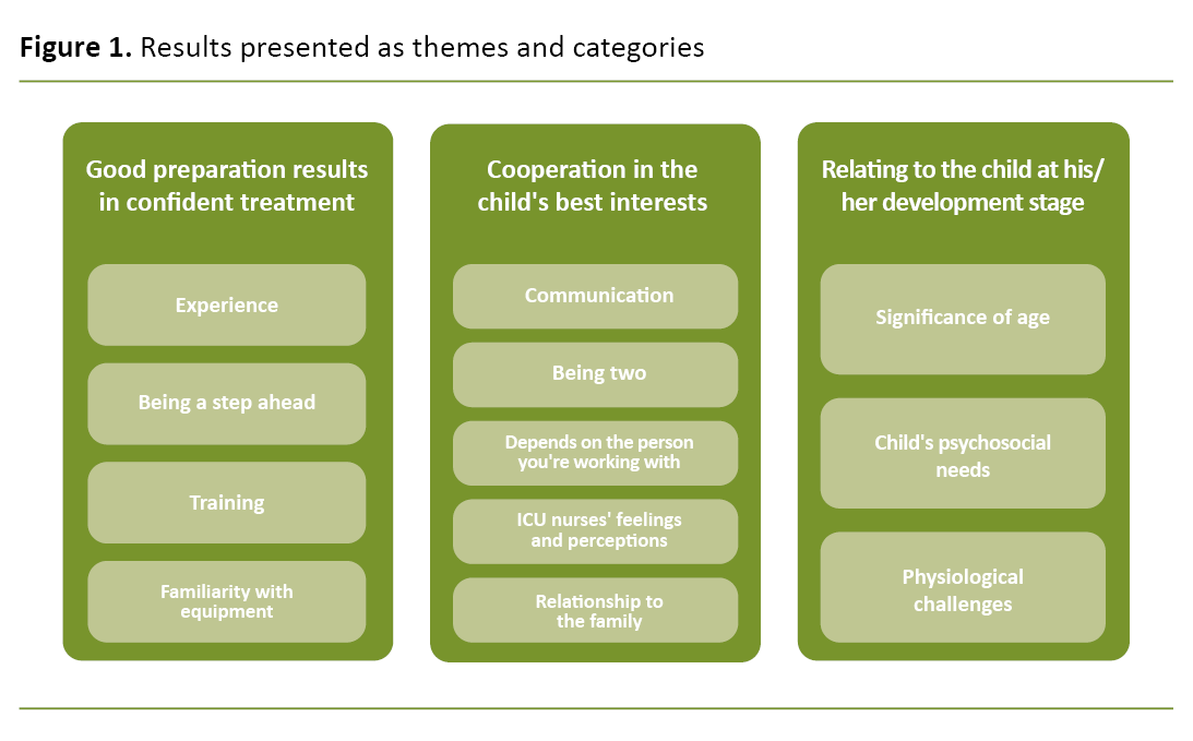 Results: The analysis identified three themes: good preparation leads to safe treatment, cooperation in the child’s best interests, and relating to children according to their development stage. Each theme is illustrated by three to five categories.