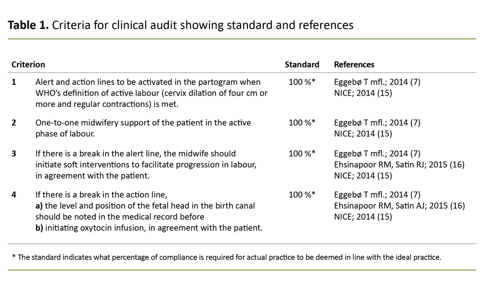 The standard for compliance with all criteria was set at 100 per cent. No optimal level has been determined for compliance with the criteria in a clinical audit, but it should be achievable in order to motivate change (13).