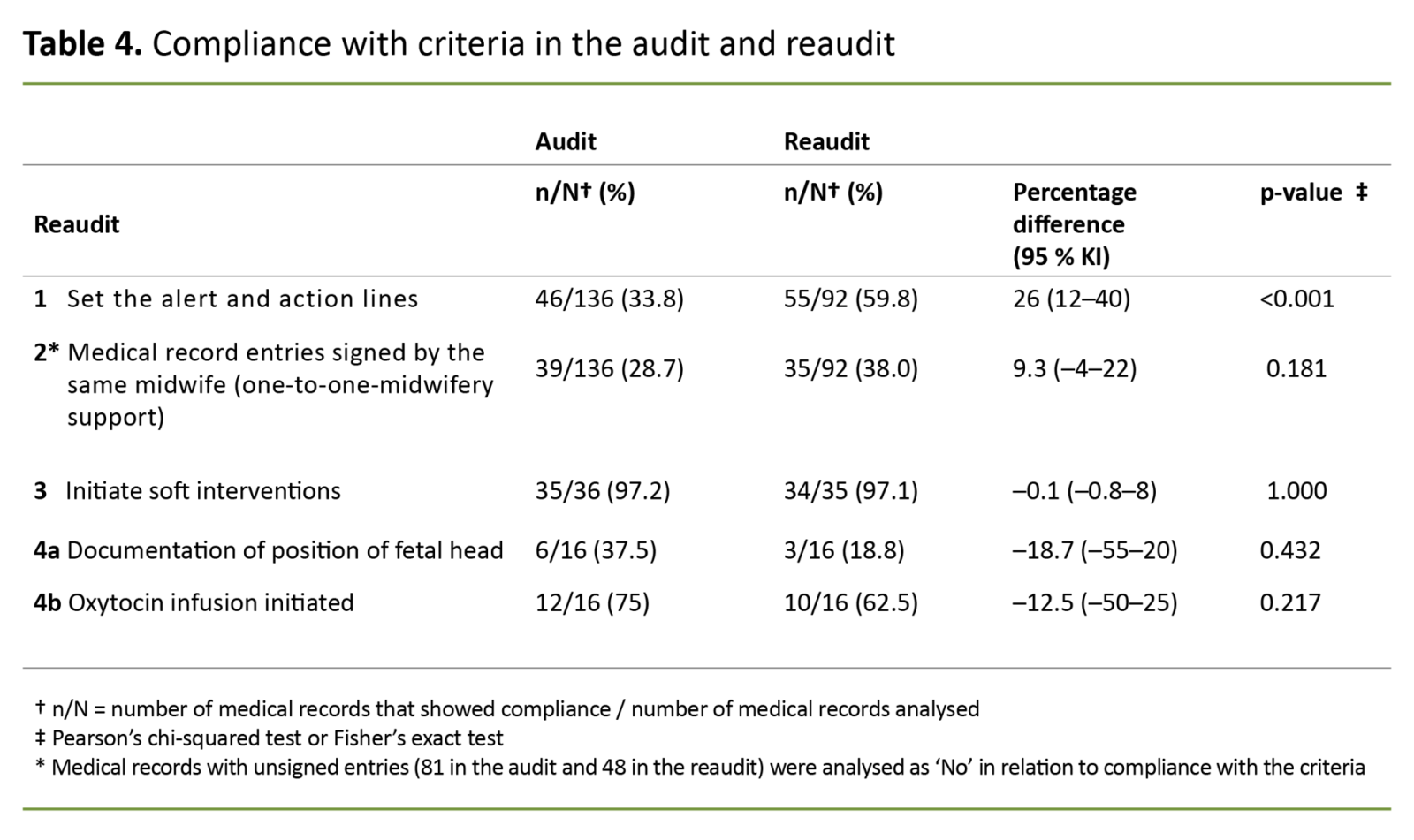 Unsigned medical entries were a surprising incidental finding because this practice violates the documentation requirement in the Health Personnel Act (30). The reaudit showed a higher percentage of medical records where all entries were signed by the same midwife, but the change was not statistically significant.