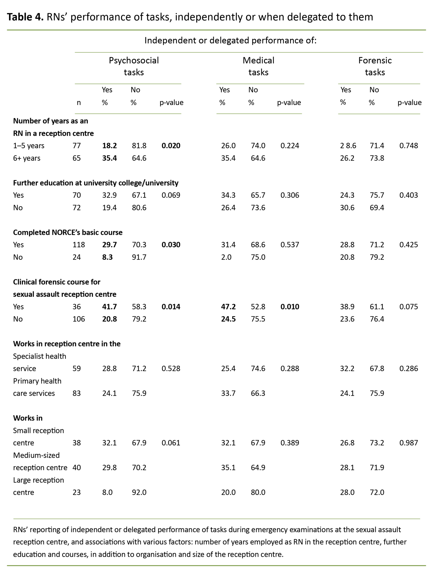 Results: The study had a response rate of 50 per cent (n = 142). Registered nurses from all 24 sexual assault reception centres in Norway were represented. All were female and two out of three had more than 10 years’ work experience. One out of four registered nurses had completed a course in forensic medicine. In relation to forensic tasks such as collecting trace evidence on the surface of the body and oral cavity, three out of five registered nurses reported that they performed these actions independently or when the examining doctor delegated the tasks to them. No nurses reported collecting trace evidence from the genitalia or rectum independently or by delegation. Courses in clinical forensic medicine do not appear to impact on the registered nurses’ independence and delegated performance of forensic tasks. Registered nurses who had acquired competence through the basic course or the clinical course in forensic medicine or who had more than five years’ work experience in a sexual assault reception centre more often reported that they performed and documented psychosocial care and medical tasks either independently or when delegated to do so by the examining doctor, compared with those who did not possess such competence. Nine out of ten registered nurses wished to have greater competence.
