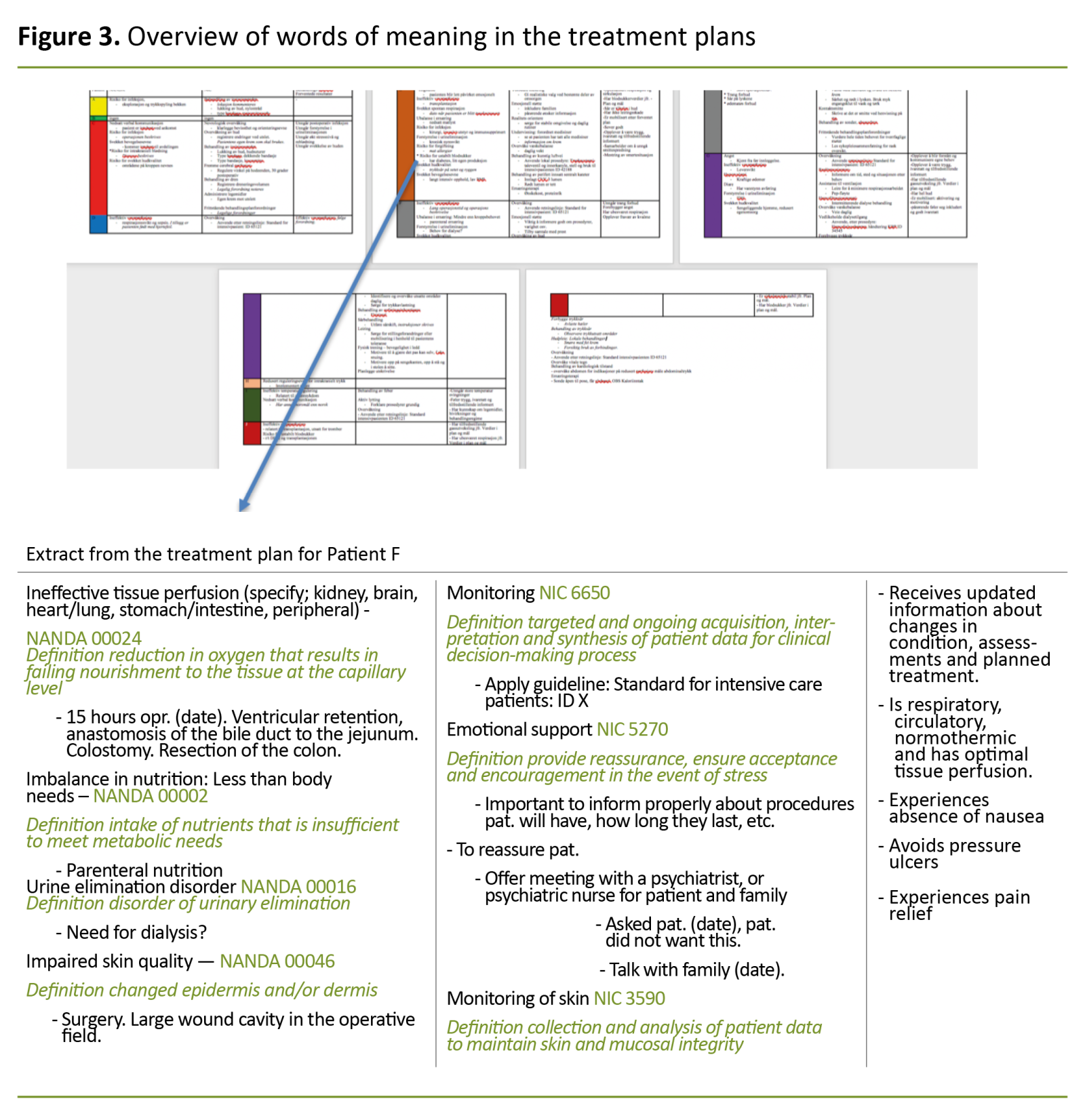 In discourse theory, a plan is a nodal point, as it is a privileged sign around which the other signs are organised and from which they derive their meaning (Figure 5). It also shows how NANDA and NIC are used in combination with supplementary free text. We saw the same practice for the other patients as well.