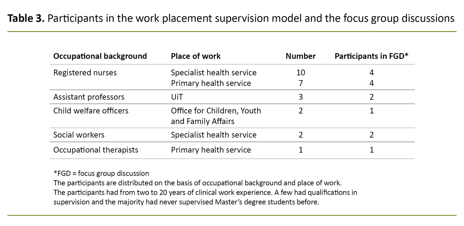 All participants in the work placement supervision model (work placement supervisors and academic supervisors) were invited to take part in the focus group discussions. The work placement supervisors represented the specialist and primary health services and formed two focus groups. In addition, the students formed one focus group since they were the end-users.