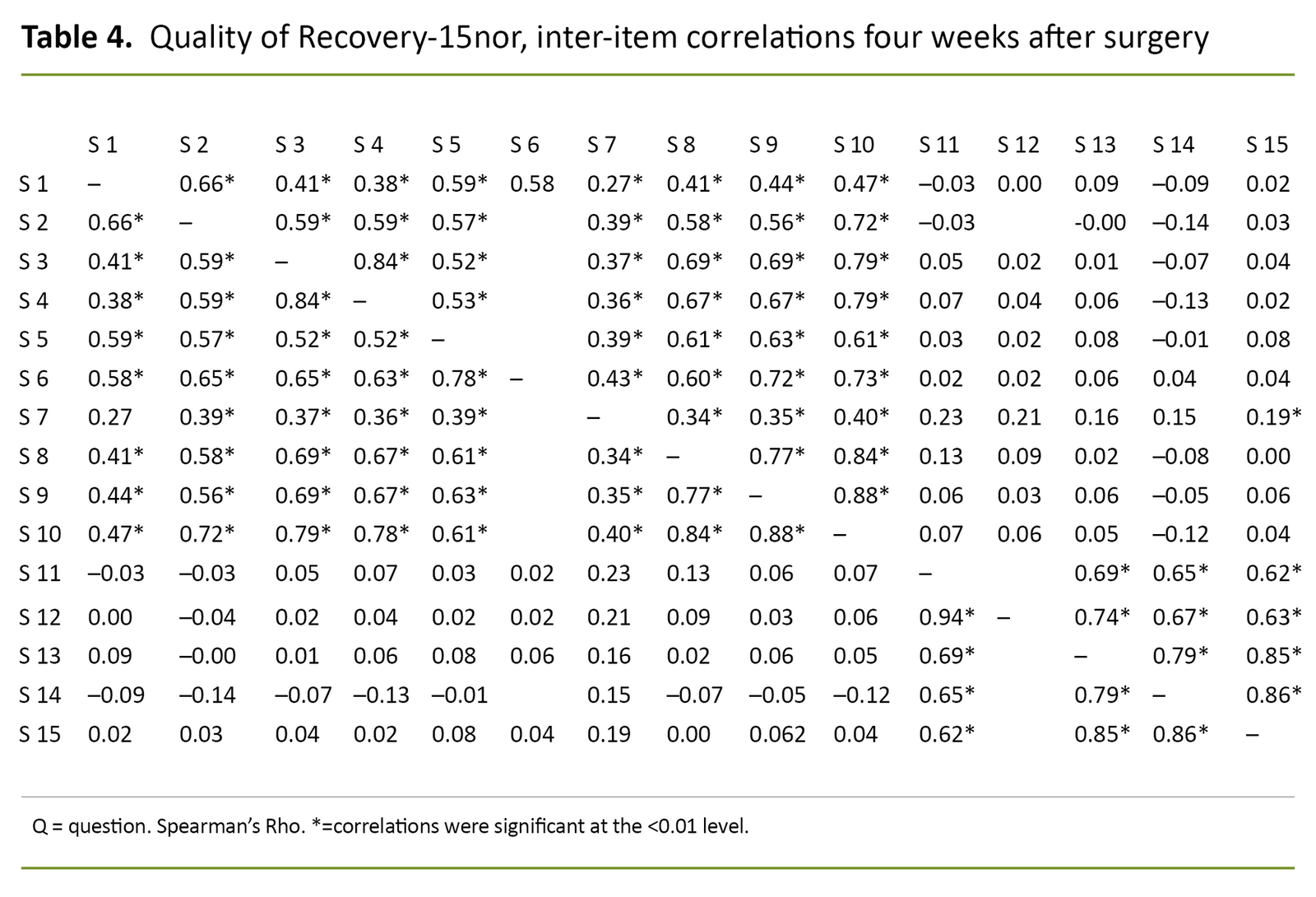 Inter-item correlations of the QoR-15nor showed acceptable to good reliability in most areas. For questions 1–10, the correlation varied between 0.17 and 0.69 on the first postoperative day and between 0.38 and 0.88 four weeks after surgery. The correlations between these questions were also significant.