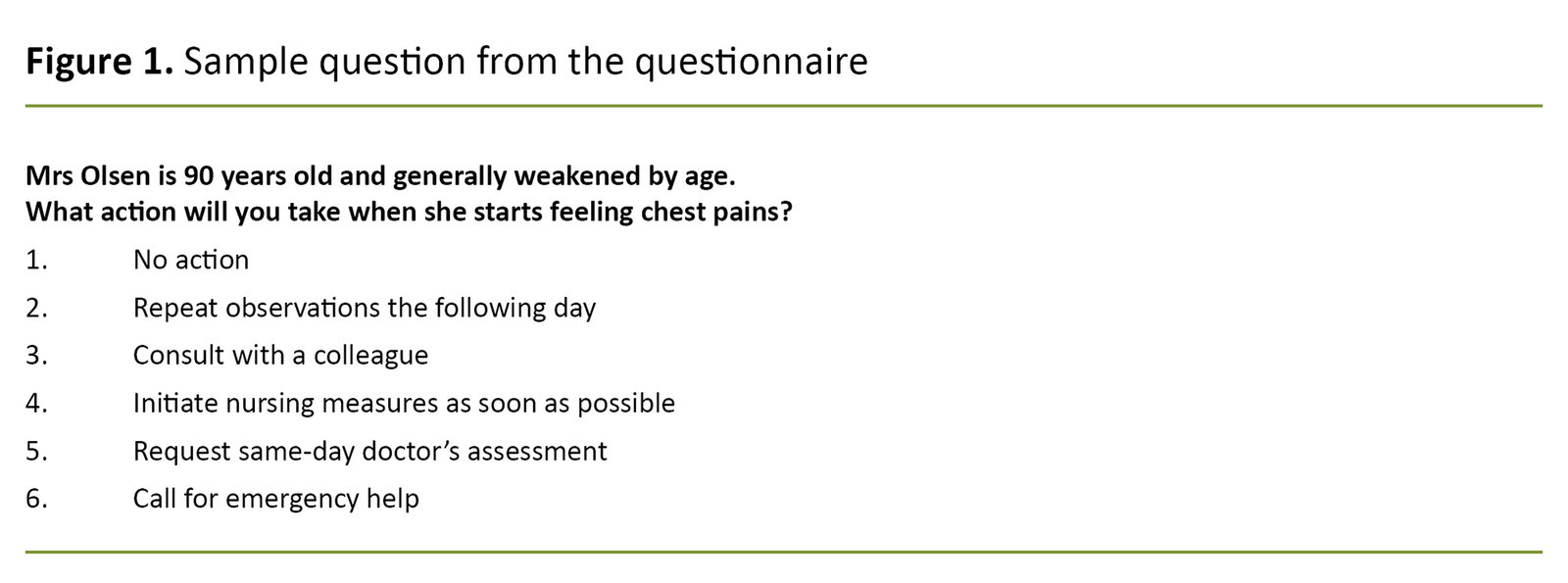 The survey questions were intended to collect statistically measurable data concerning the judgement that health personnel make when confronted with ill health: ‘What action will you take when vulnerable Ms Olsen, who is 90 years old, develops new symptoms …?’. The participants were asked to choose one of six response alternatives (Figure 1).