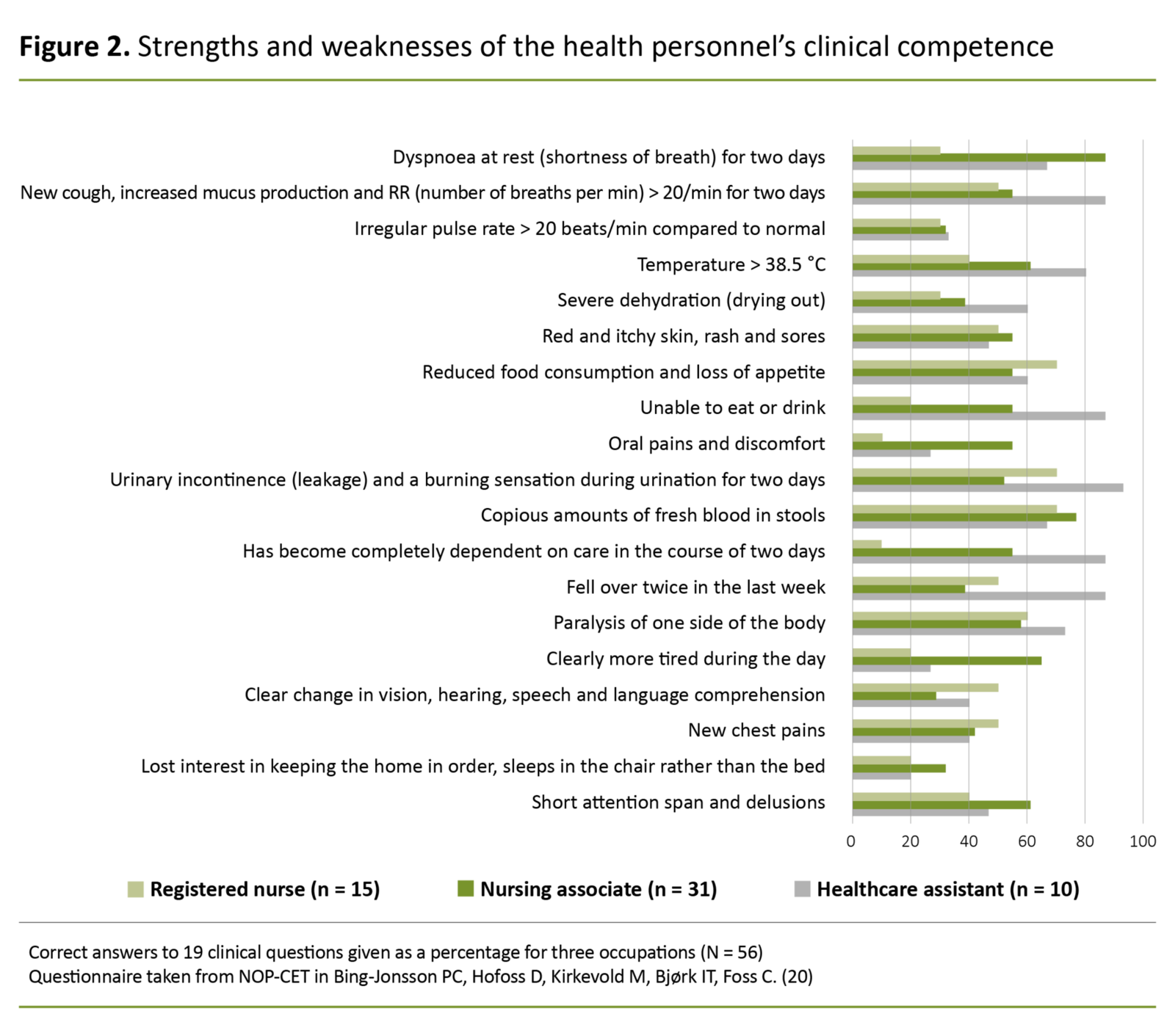 Results: There were 56 participants. The average percentage of correct answers among the registered nurses (n = 15) was 59%. This percentage was 53% among the nursing associates (n = 31) and 41% among the healthcare assistants (n = 10). The number of correct answers was only influenced by occupational background (p-value 0.018), with the healthcare assistants’ level significantly lower compared to the registered nurses (p-value 0.013). Overall, the health personnel gave the highest number of correct answers in response to clear symptoms of new disease, and the most incorrect answers in response to vague, complex conditions and two emergency scenarios. As many as 62 per cent reported a need to enhance their own clinical competence.