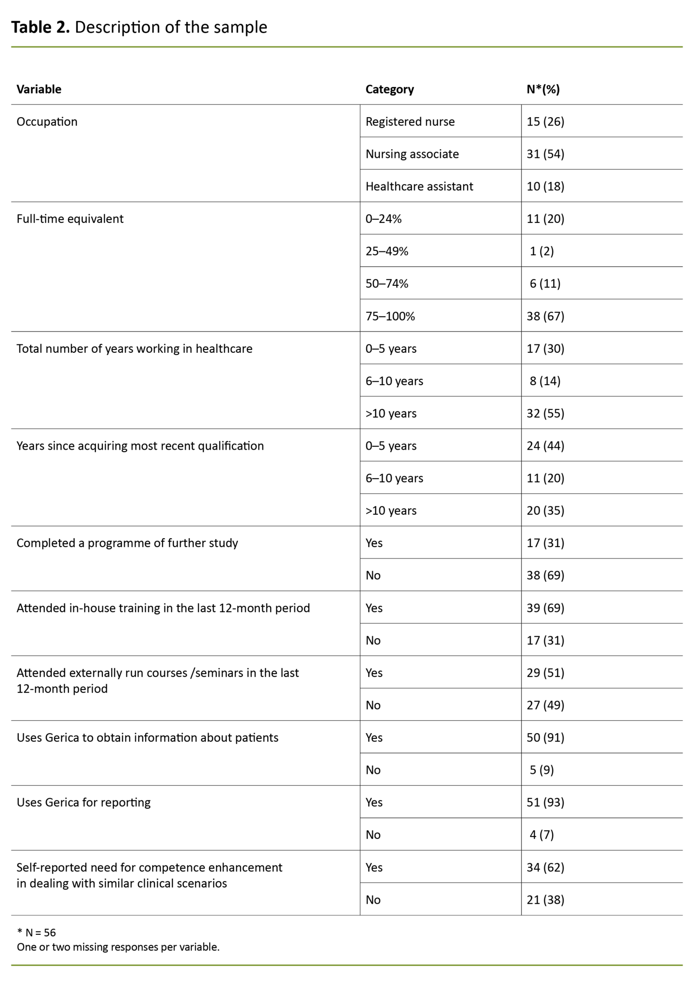 The survey achieved a response rate of 51. The sample (N = 56) consisted of nursing associates (n = 31), registered nurses (n = 15) and healthcare assistants (n = 10) (Table 2). One person with no specified occupation was excluded from the study. The sample represented 79 percent of RNs, 55 percent of nursing associates and 29 percent of healthcare assistants working at the care home.