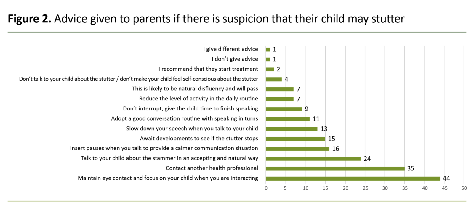 The advice most frequently given by the public health nurses to the parents of children who stutter, was to maintain eye contact with the child during interactions, to talk about the stutter in an accepting and natural way, and to contact a specialist. Figure 2 shows the advice given to parents.