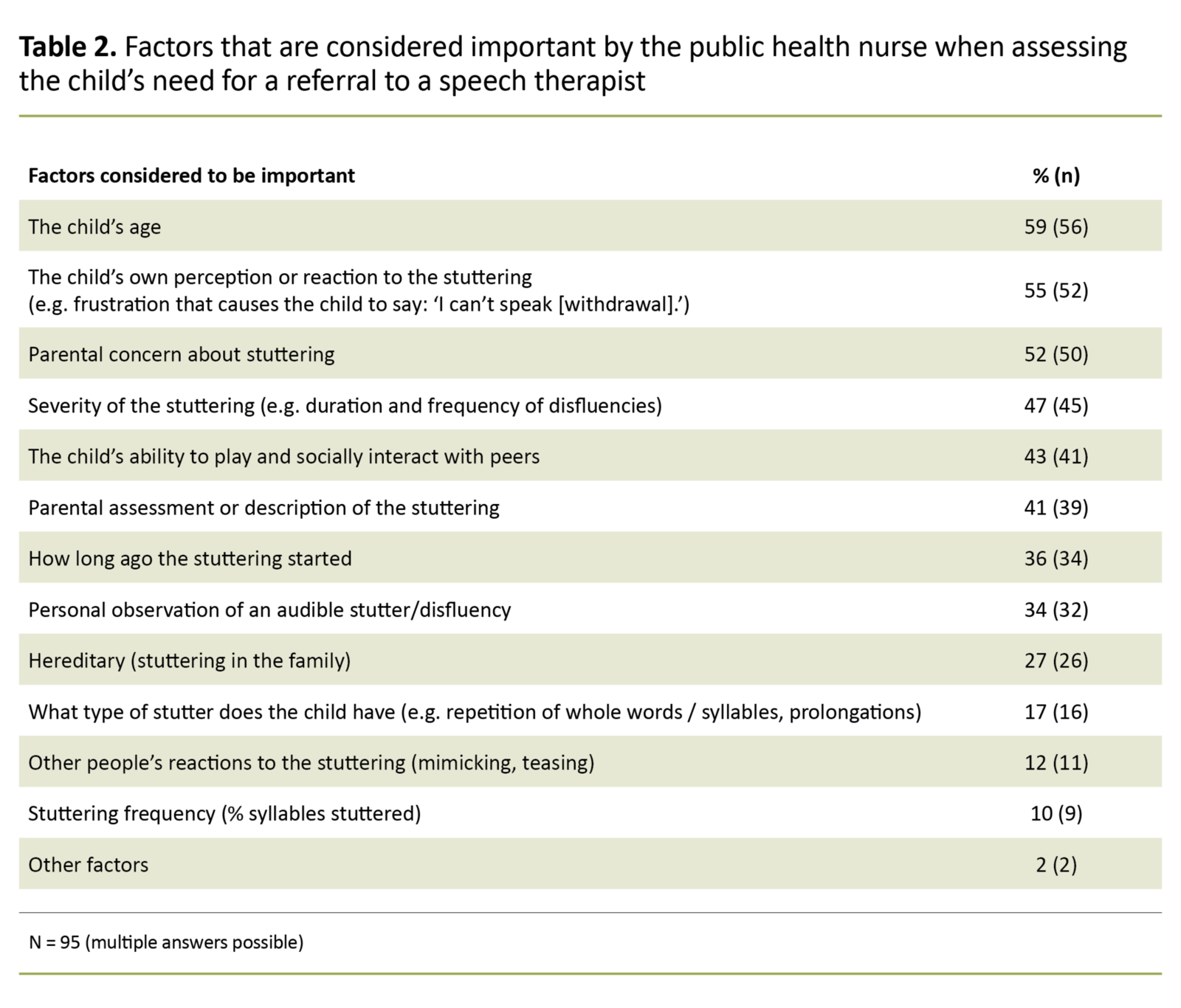 The public health nurses attached importance to different factors when assessing whether a child needs to be followed up by a speech therapist. The child’s age, the child’s perception of or reaction to the stuttering and parental concern were the factors most frequently used to decide whether further follow-up or referral was required (Table 2).