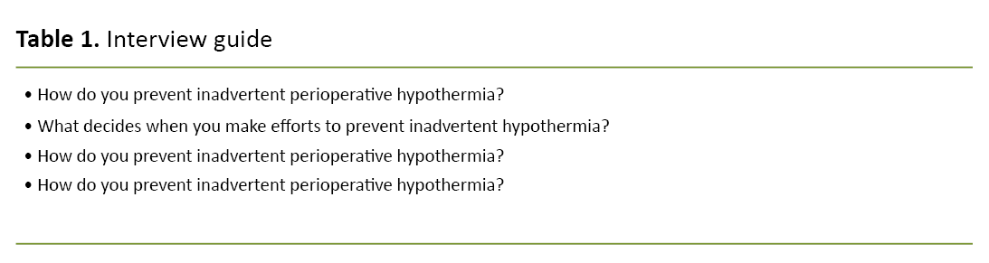 We found many quantitative studies on hypothermia and its outcomes (1, 2). However, there is little qualitative research on nurse anaesthetists’ experience of preventing inadvertent hypothermia. In their qualitative studies, Loe and Moe (17), and Honkavuo and Loe (18) found that body temperature measurement and preventive measures are not always carried out systematically and are not always implemented.