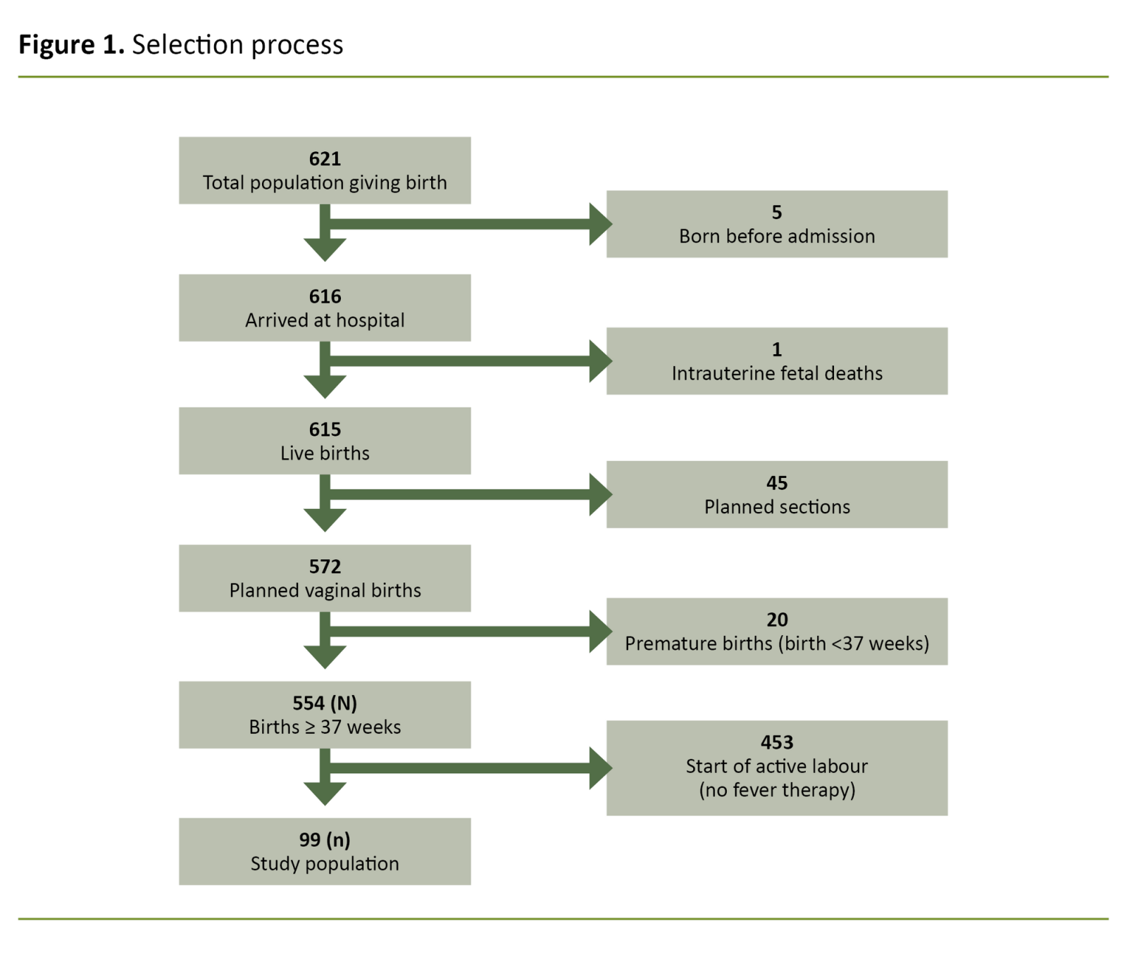 At the start of active labour, the remaining 552 had passed week 37 + 0. The review of medical records showed that 99 of 552 patients (18 per cent) received general antipyretic treatment and/or antibiotics on the grounds of suspected infection during labour or IAI. A documented temperature of ≥38°C was found in 67 of 552 patients (12 per cent).