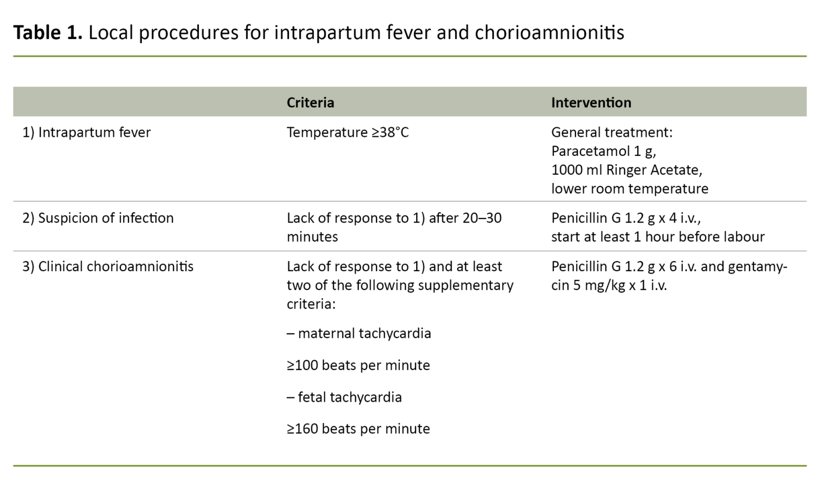 In the guidance on birthing assistance (12) and local procedures, antibiotic therapy and prompt planning of delivery are recommended on suspicion of IAI. If fever occurs with no sign of infection, general fever-reducing measures with paracetamol and fluid by mouth or intravenously are proposed.