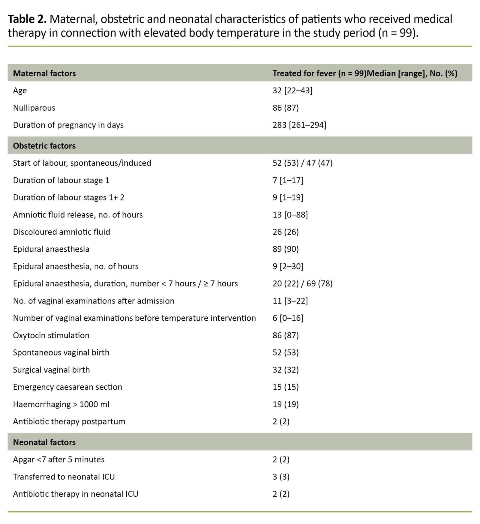 Maternal, obstetric and neonatal characteristics of patients who received medical therapy in connection with elevated body temperature (n = 99) are presented in Table 2.