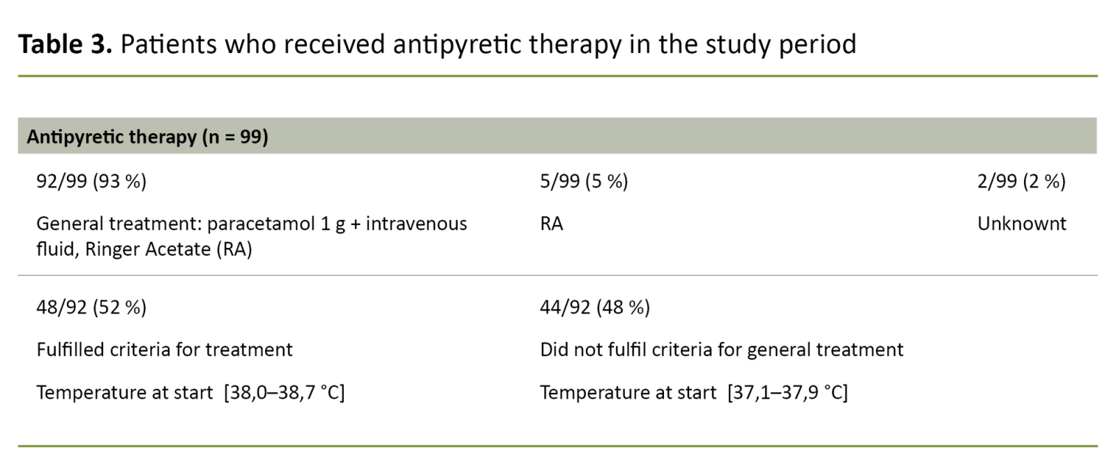 Of the six patients who did not meet the criteria, two had temperatures under 38°C. The three others had temperatures of 38.0–38.1°C and zero or one supplementary factor. The temperature of one of them was not recorded. All patients who were supposed to receive treatment, did receive it.